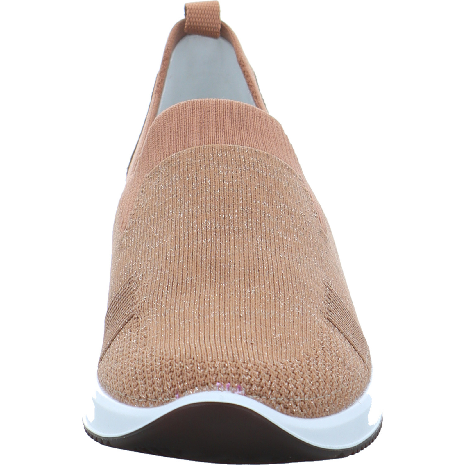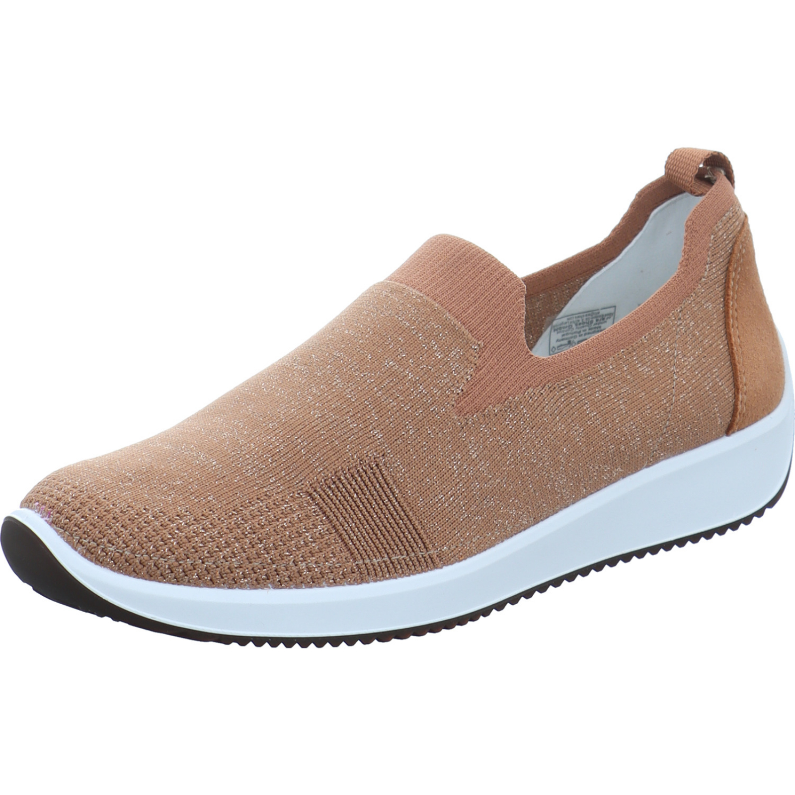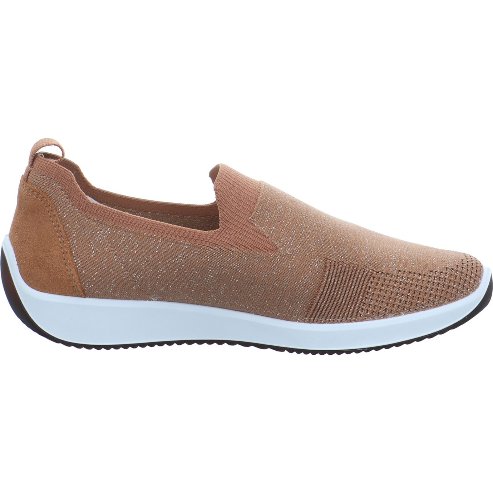 info@ara-shoes.de_____Der mittelbraun-goldene Damen-Slipper Lissabon 12-54042-03 von Ara besteht aus Stretch-Textil. Die High Soft Technologie verbindet eine flexible Laufsohle und ein komfotables Wechselfußbett für einen optimalen Tragekomfort.