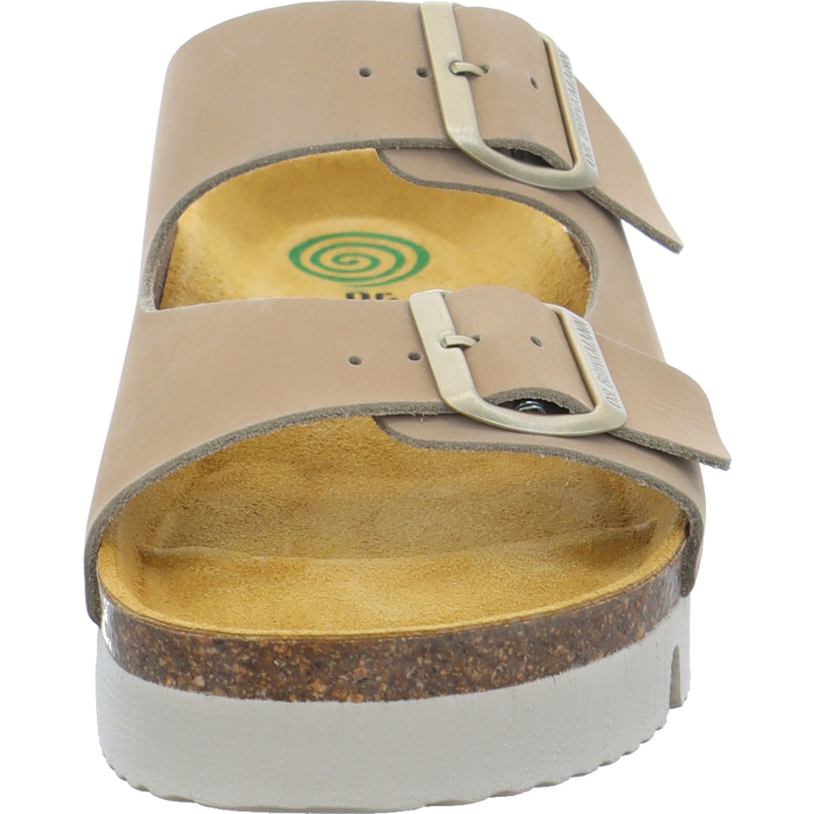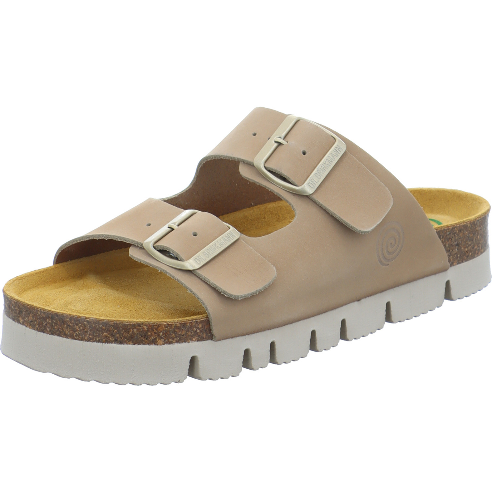 service@poelking-schuhe.de_____Die mittelbeige Damen-Pantolette 700348-08 von Dr. Brinkmann besteht aus Nubukleder und hat ein komfortables Kork-Fußbett.