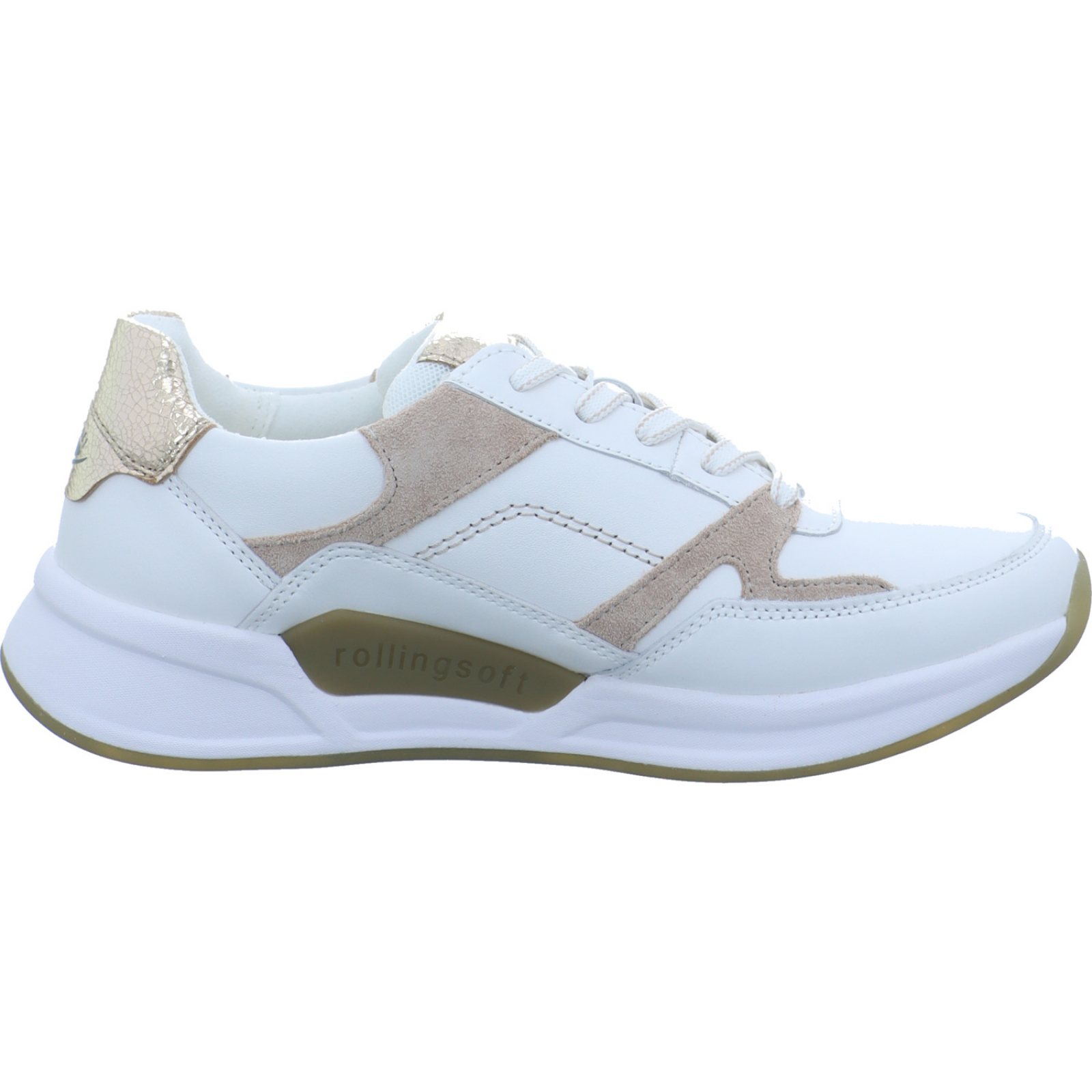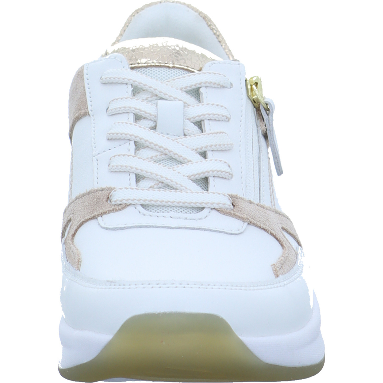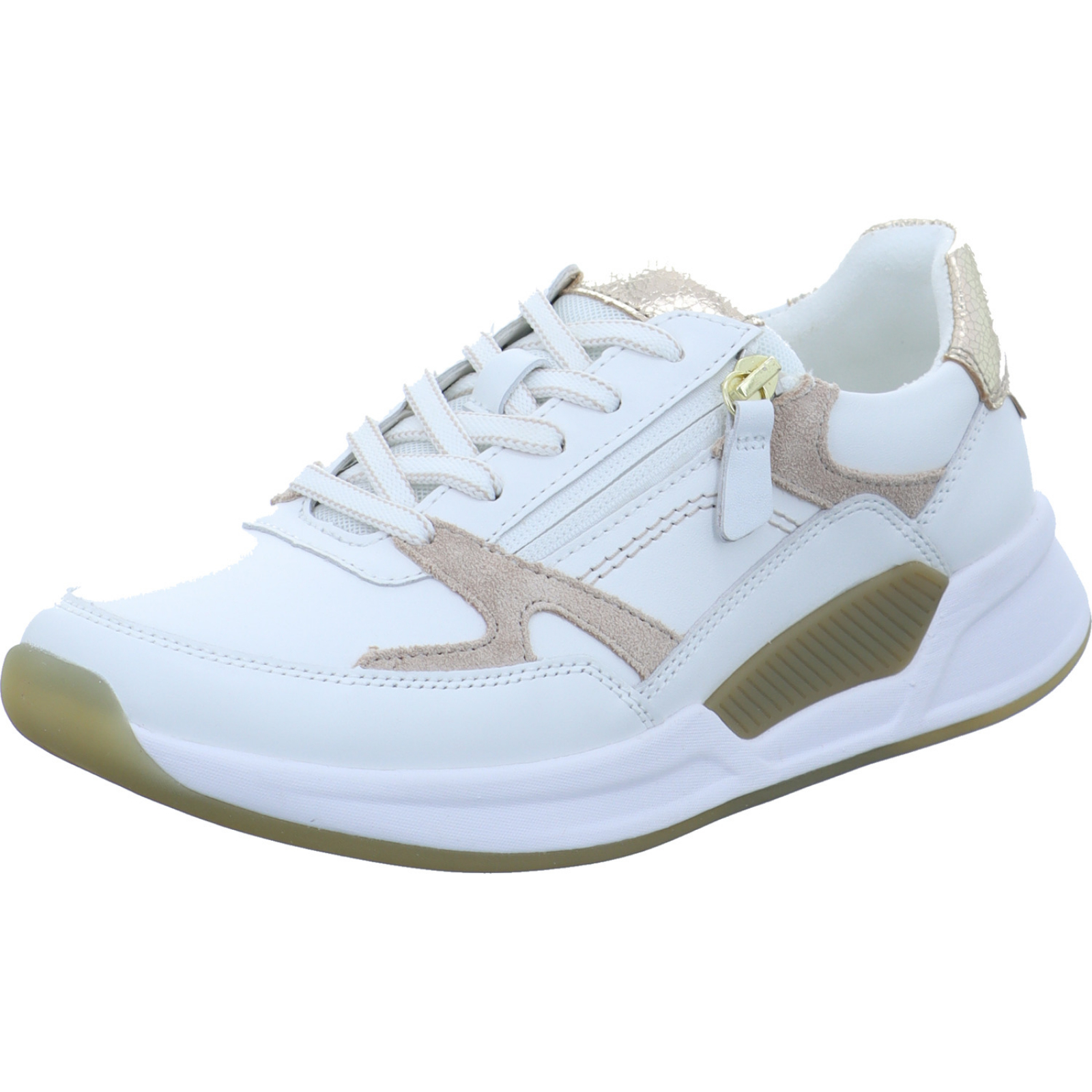 info@gabor.com_____Perfekt für den Alltag ist der weiß-gold-beige Damen-Schnürhalbschuh 86.958-52 von Rolling Soft bestehend aus Glatt- und Veloursleder sowie Mesh. Dank des Wechselfußbettes ist auch die Nutzung von losen Einlagen kein Problem und durch die Abrollfunktion wird ein natürliches Ganggefühl ermöglicht. Ein weiterer Pluspunkt ist der seitliche Reißverschluss, wodurch das An- und Ausziehen schnell und einfach ist.Herstellerinformation: ara shoes GmbH