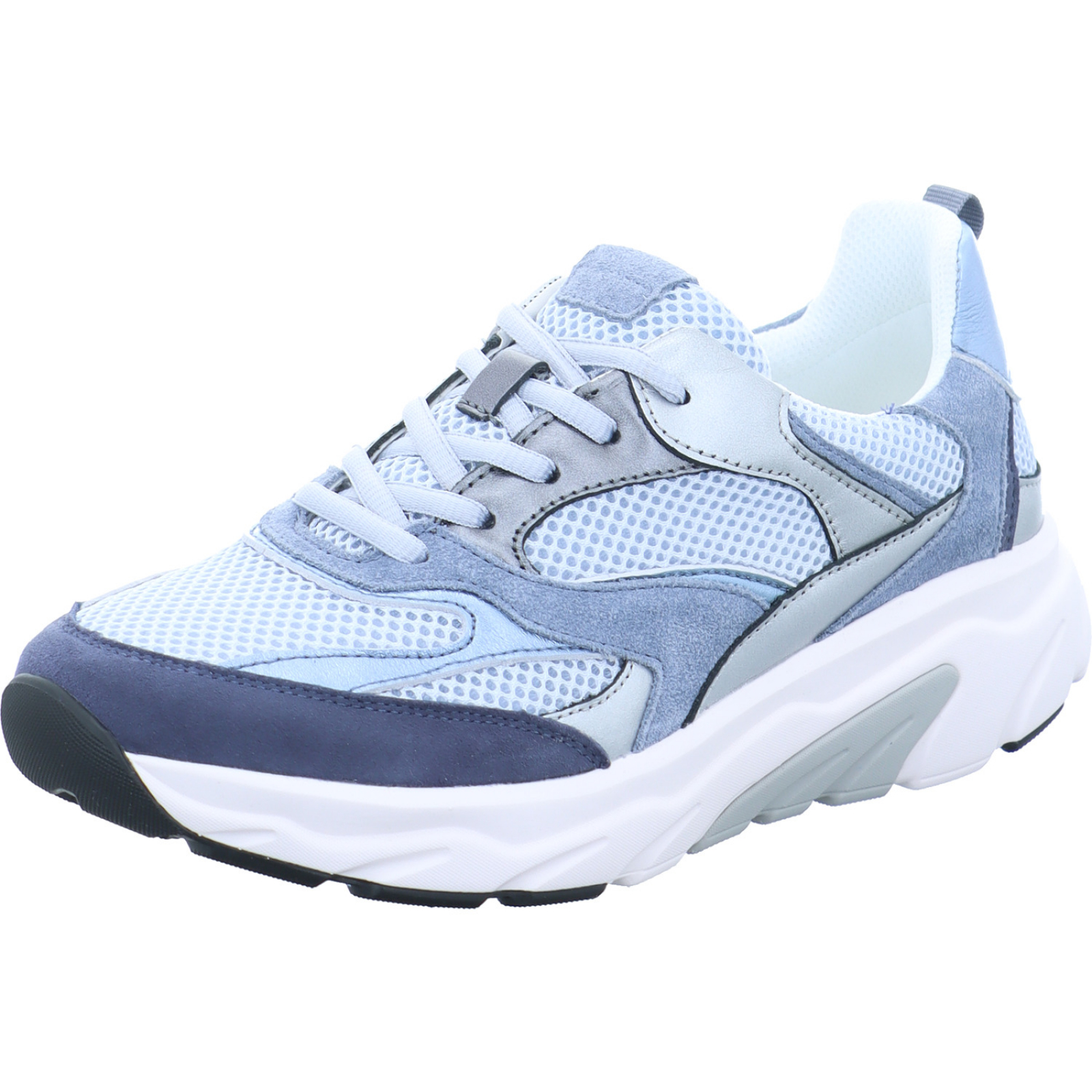 info@gabor.com_____Der blau-kombinierte Damen-Schnürhalbschuh 86.936.36 von Rolling Soft besteht aus Mesh, Velours- und Glattleder. Die Gondelsohle unterstützt durch ihre spezielle Form das natürliche Abrollverhalten.