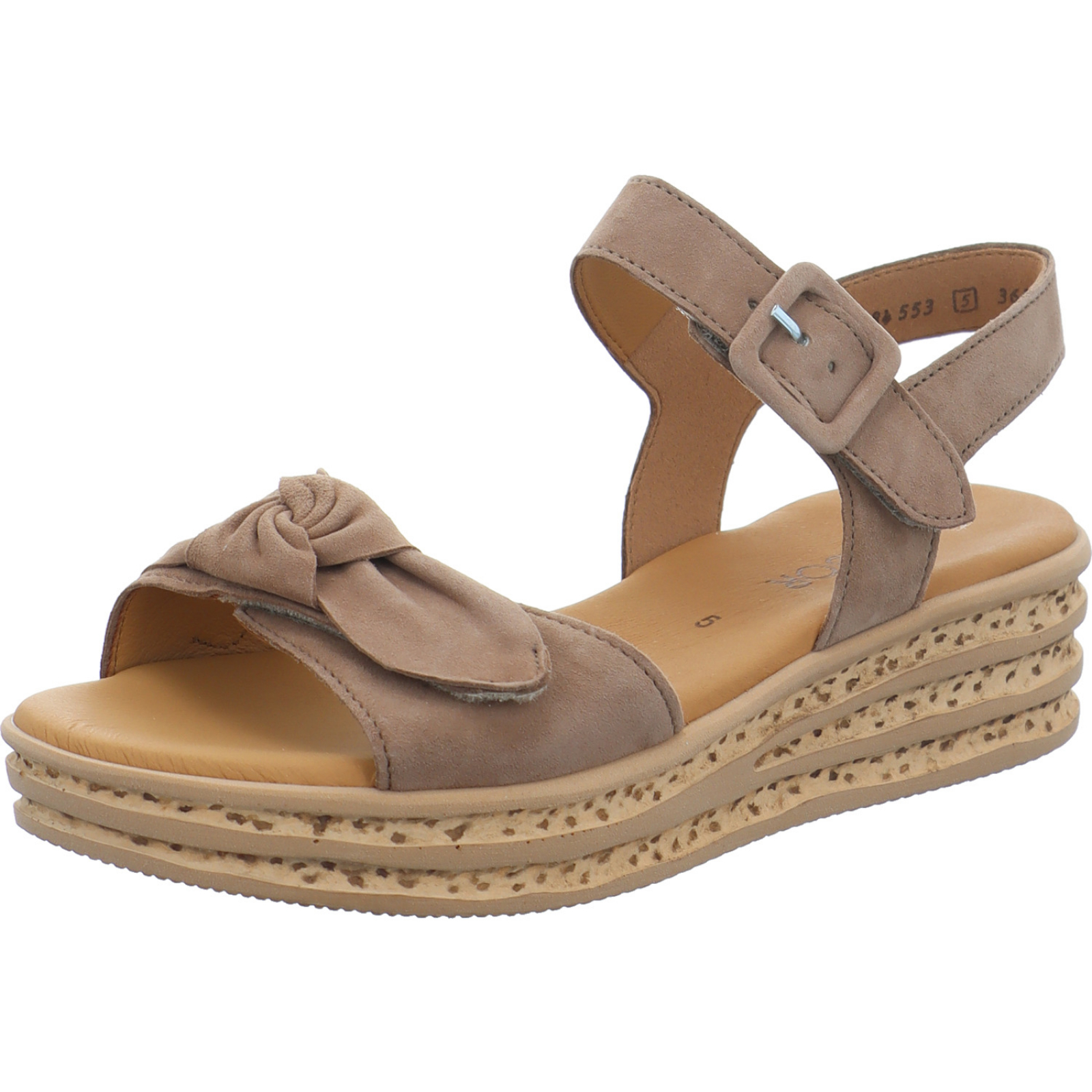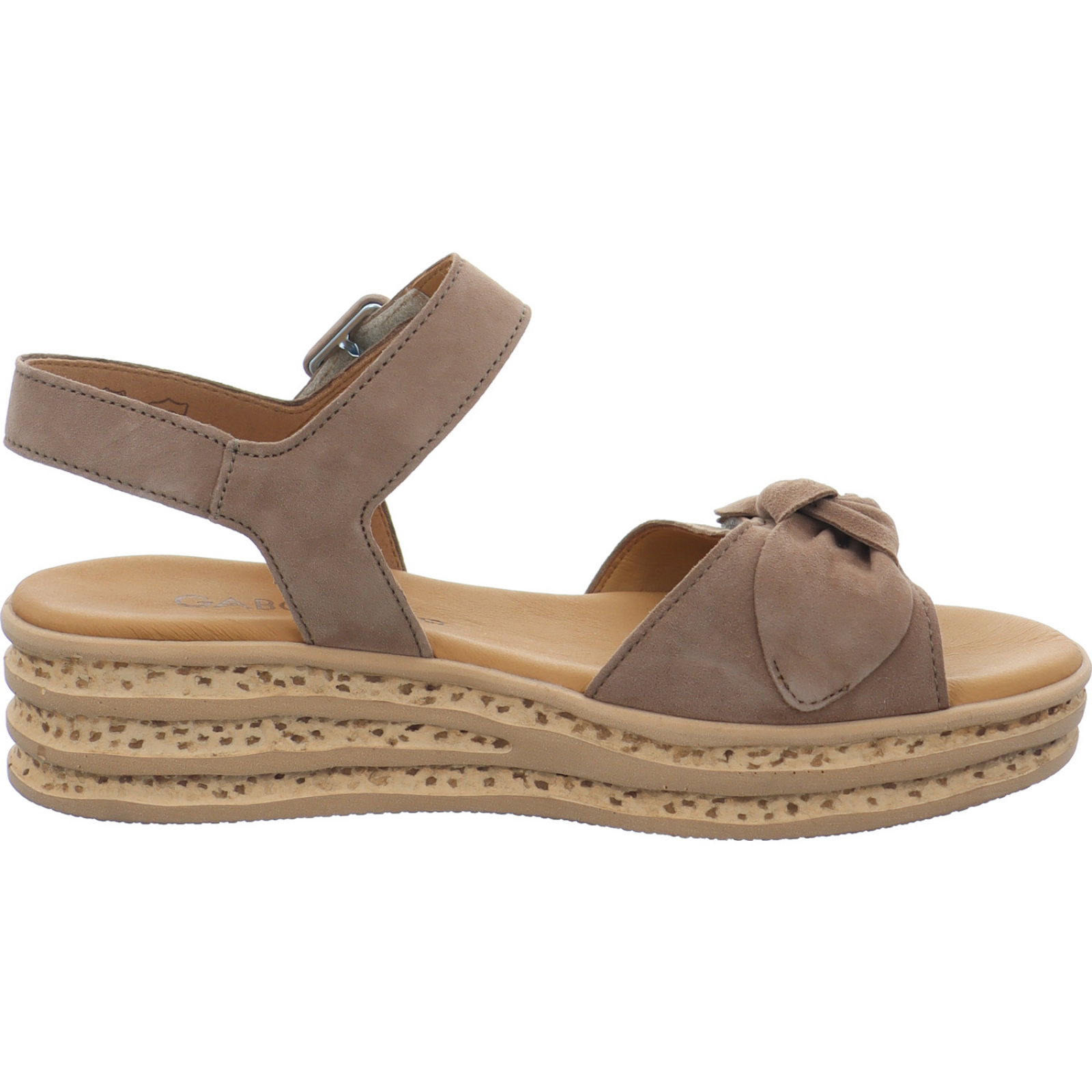 info@gabor.com_____Die mittelbraune Damen-Keilsandalette 84.553-18 von Gabor besteht aus Veloursleder. Das weiche Leder-Fußbett sorgt auch bei langen Tragen für einen optimalen Komfort.