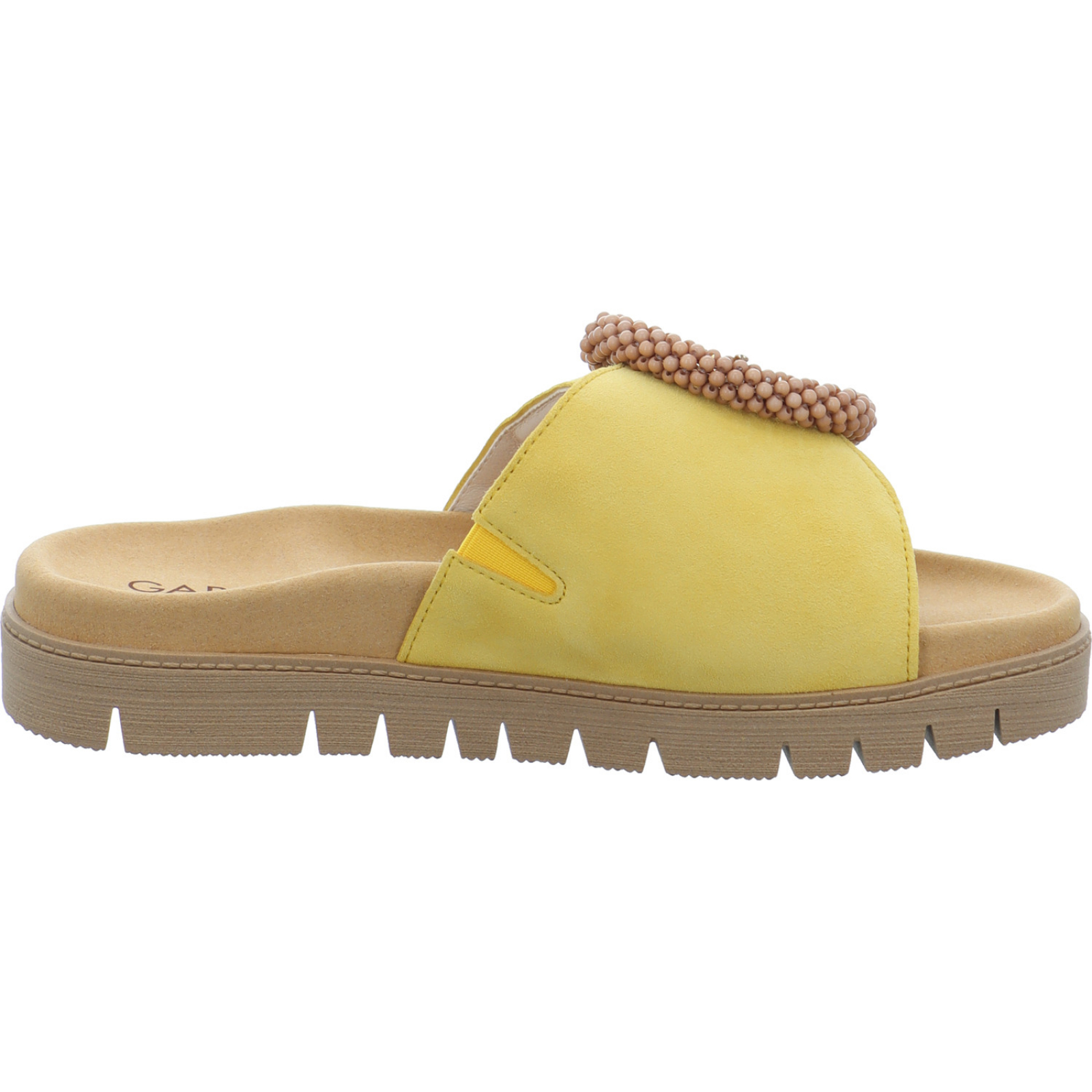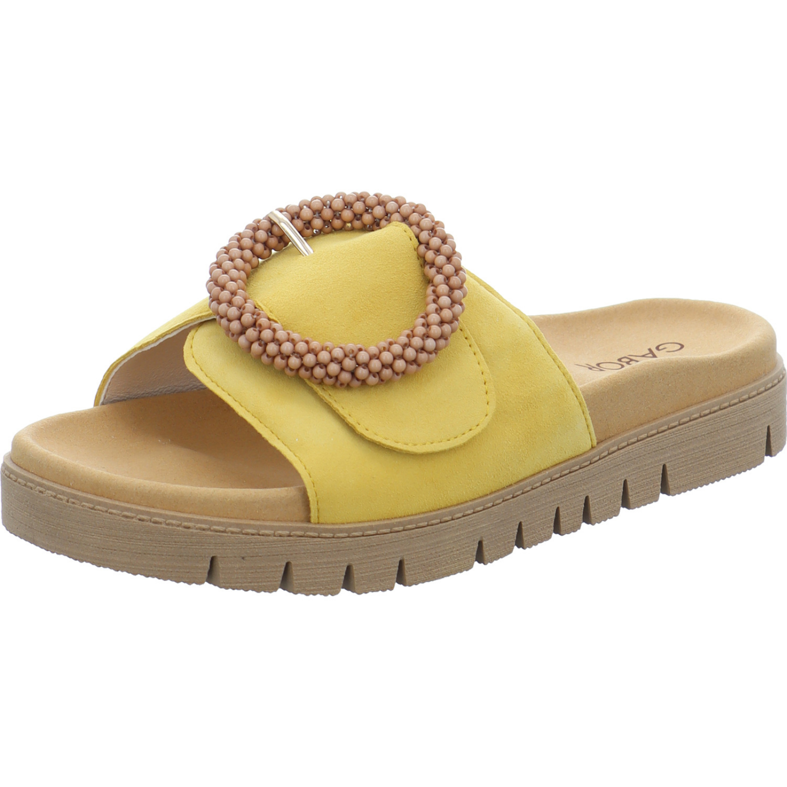 Herstellerinformation: Gabor Shoes AG Joachim-Gabor-Platz 1, 83024 Rosenheim, DE info@gabor.com_____Die stylische Damen-Pantolette 83.745.10 von der Firma Gabor besteht aus gelben Veloursleder.