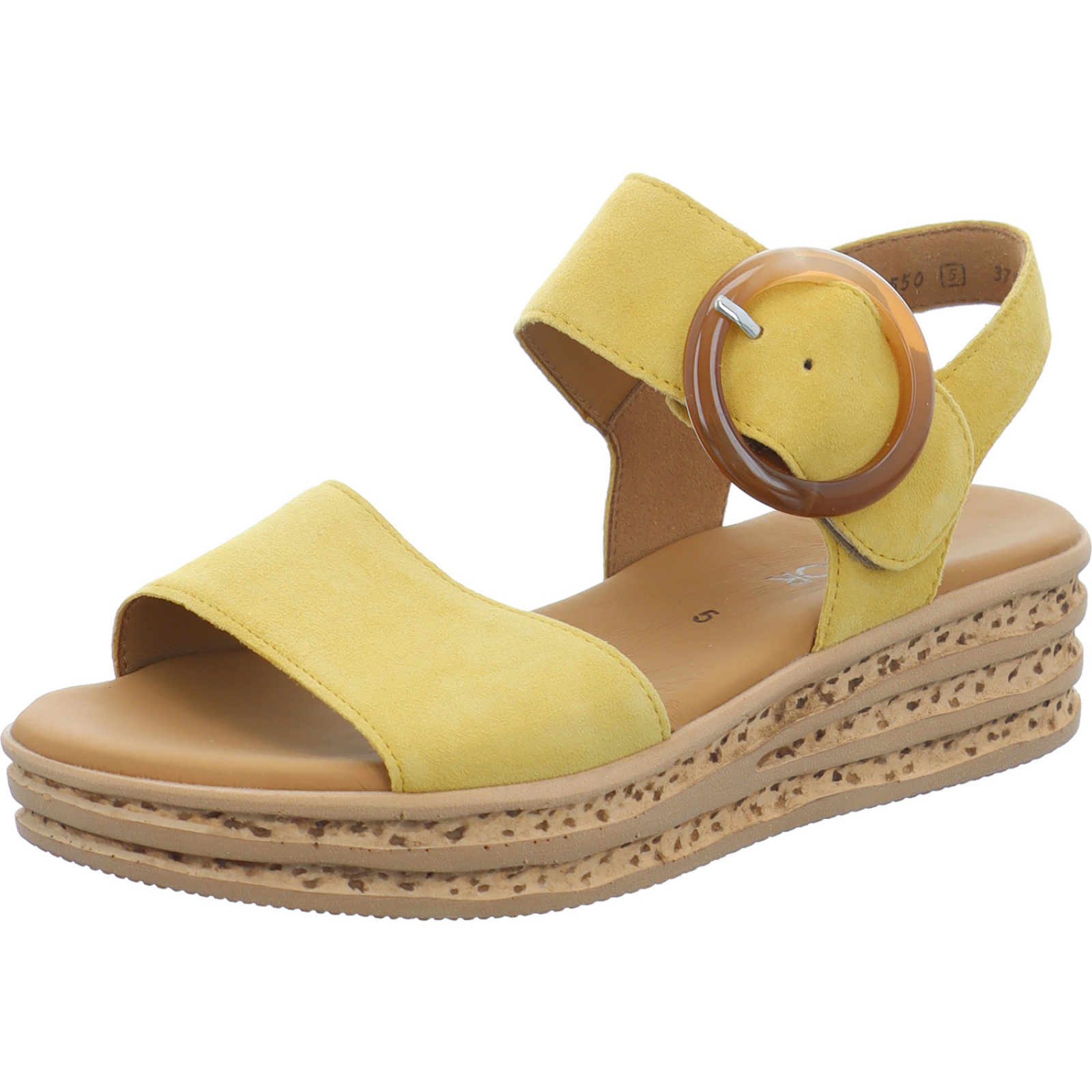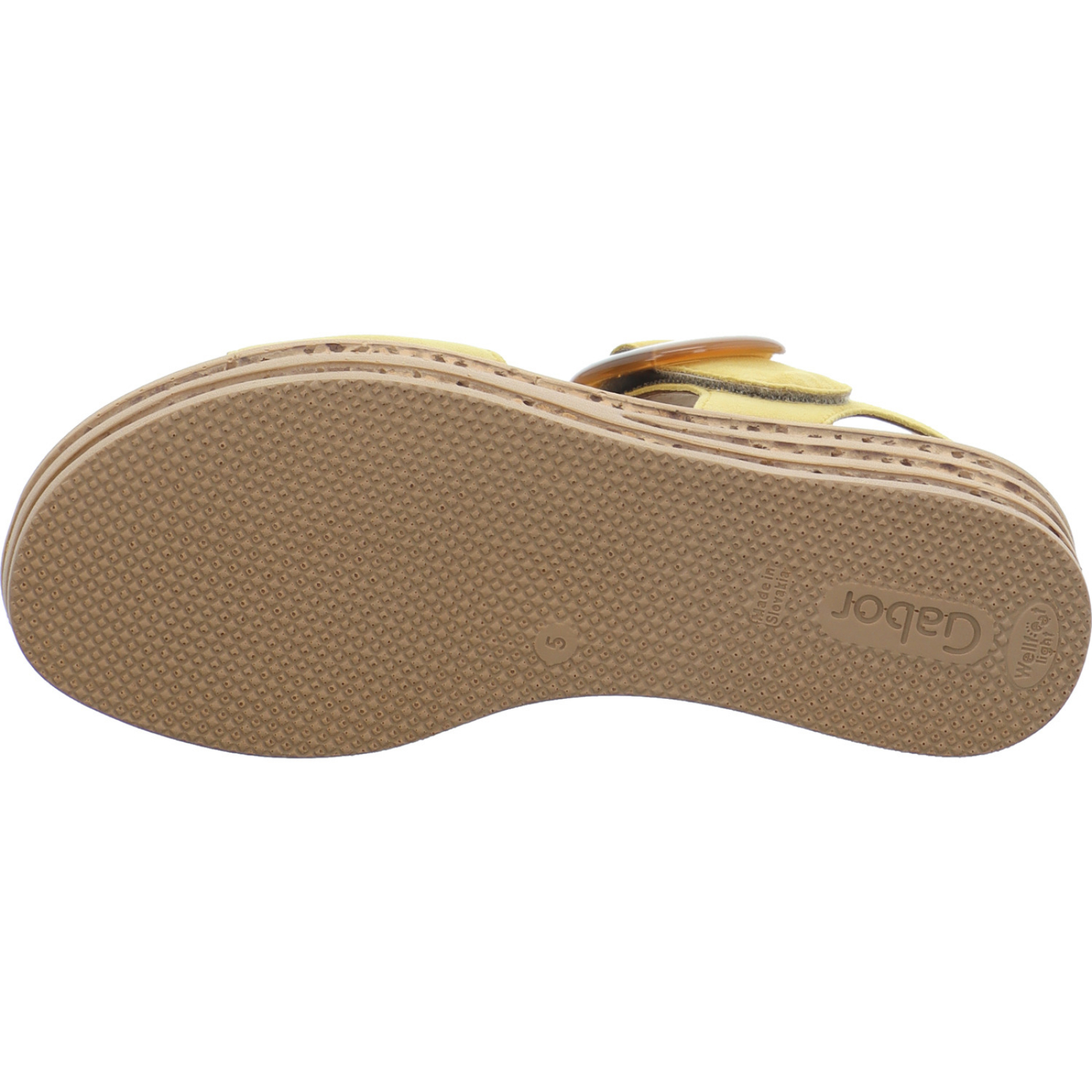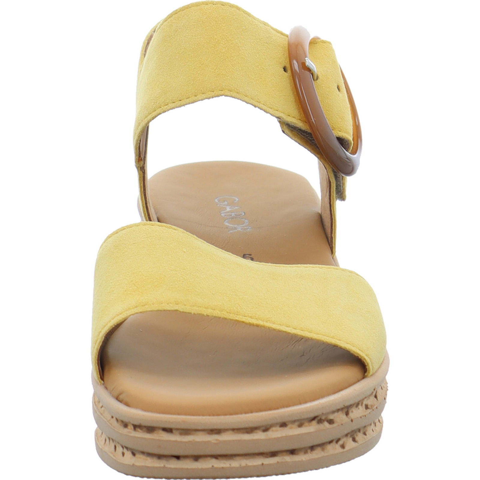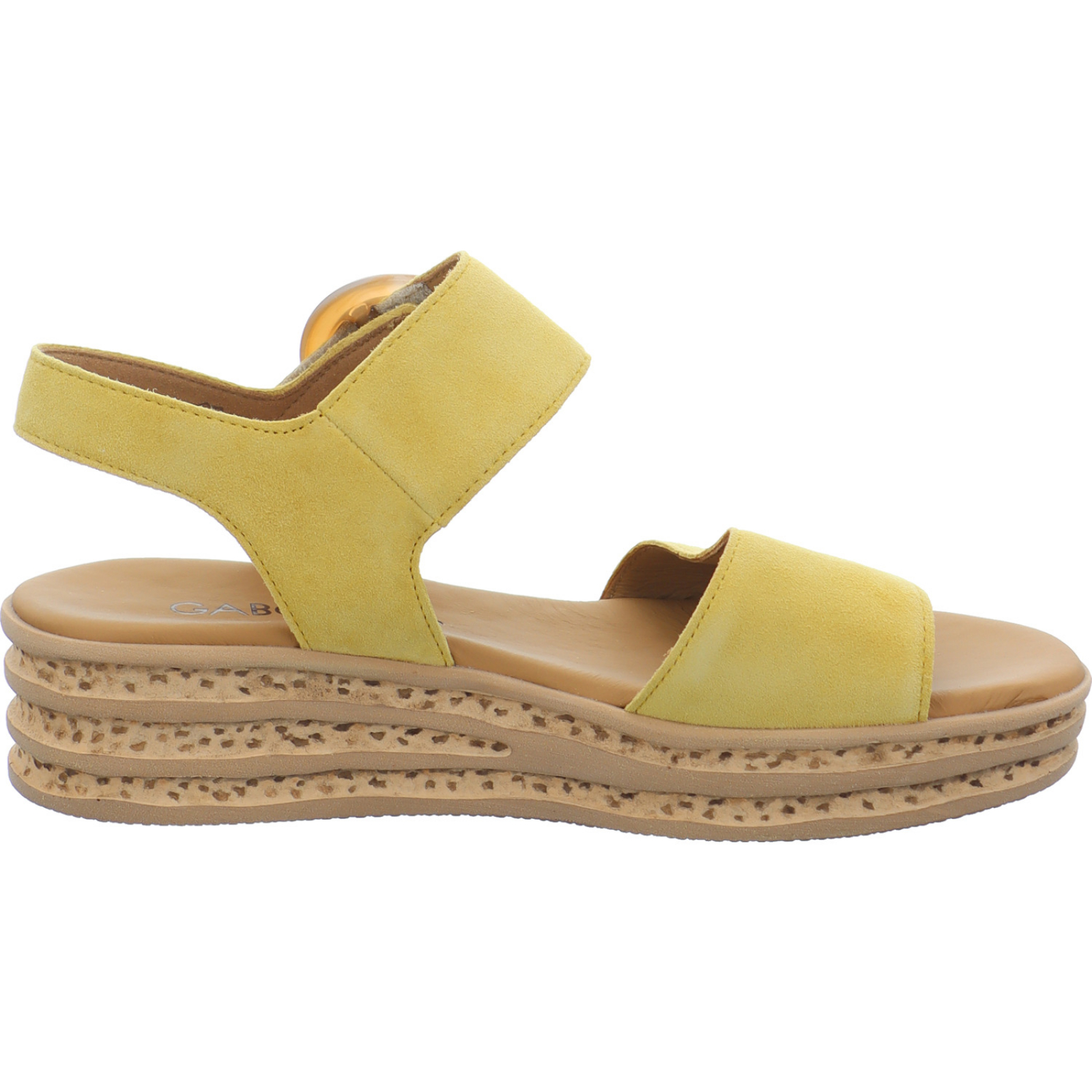 info@gabor.com_____Die gelbe Damen-Sandalette 84.550.13 von der Firma Gabor besteht aus Veloursleder und hat ein sehr komfortables Fußbett. Die Wellfeet Light Technologie sorgt für eine optimalen Dämpfung, welche einen verbesserten Tragekomfort unterstützt.