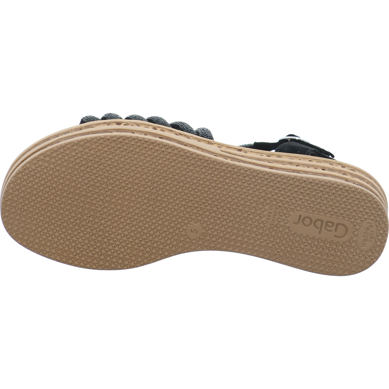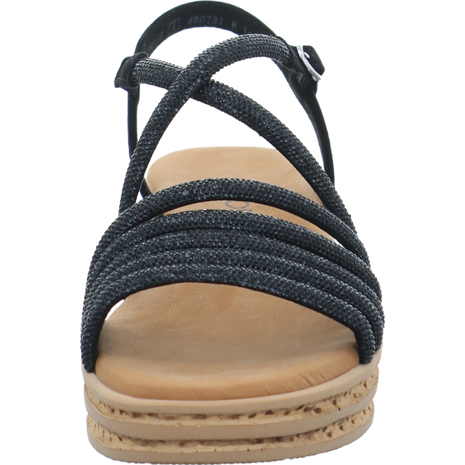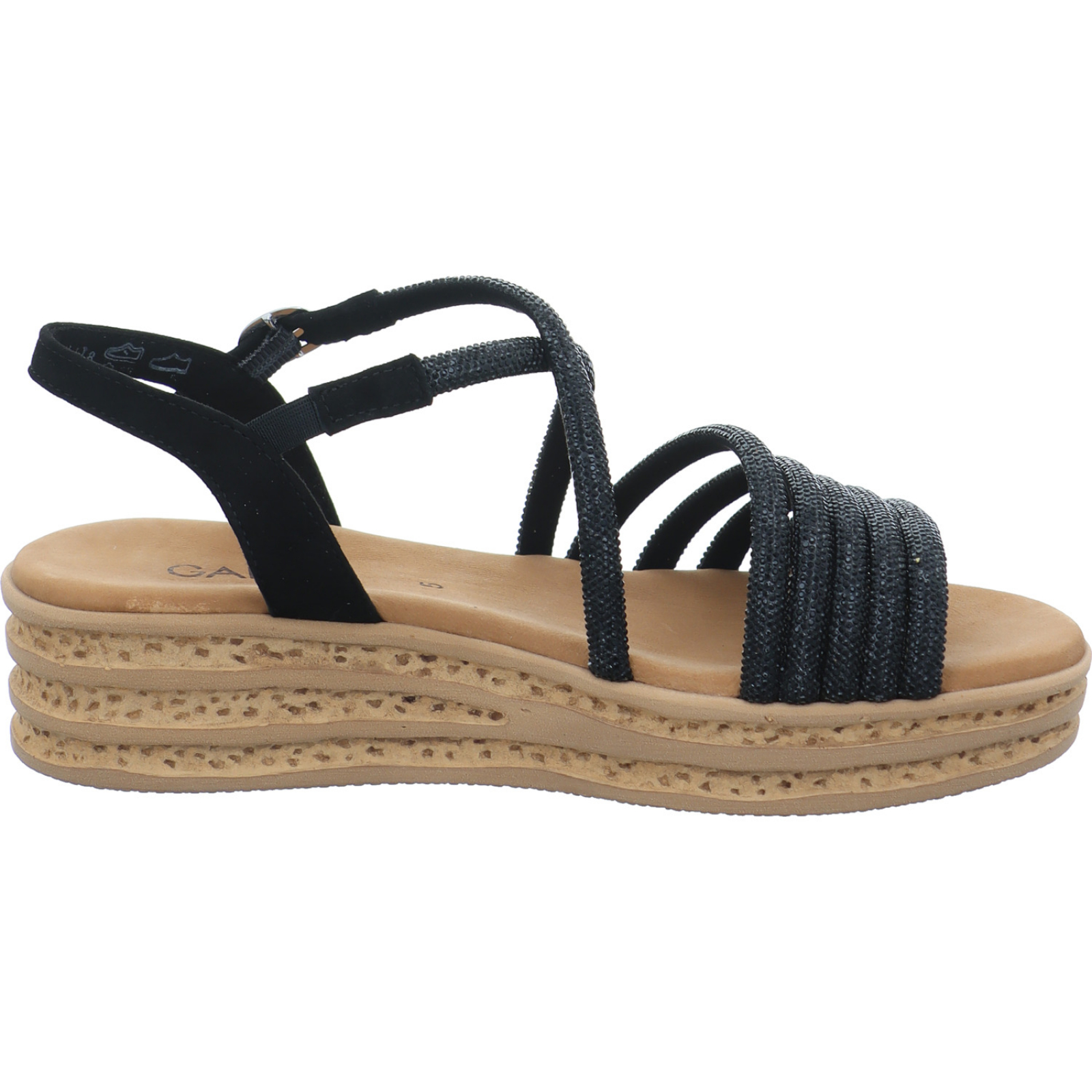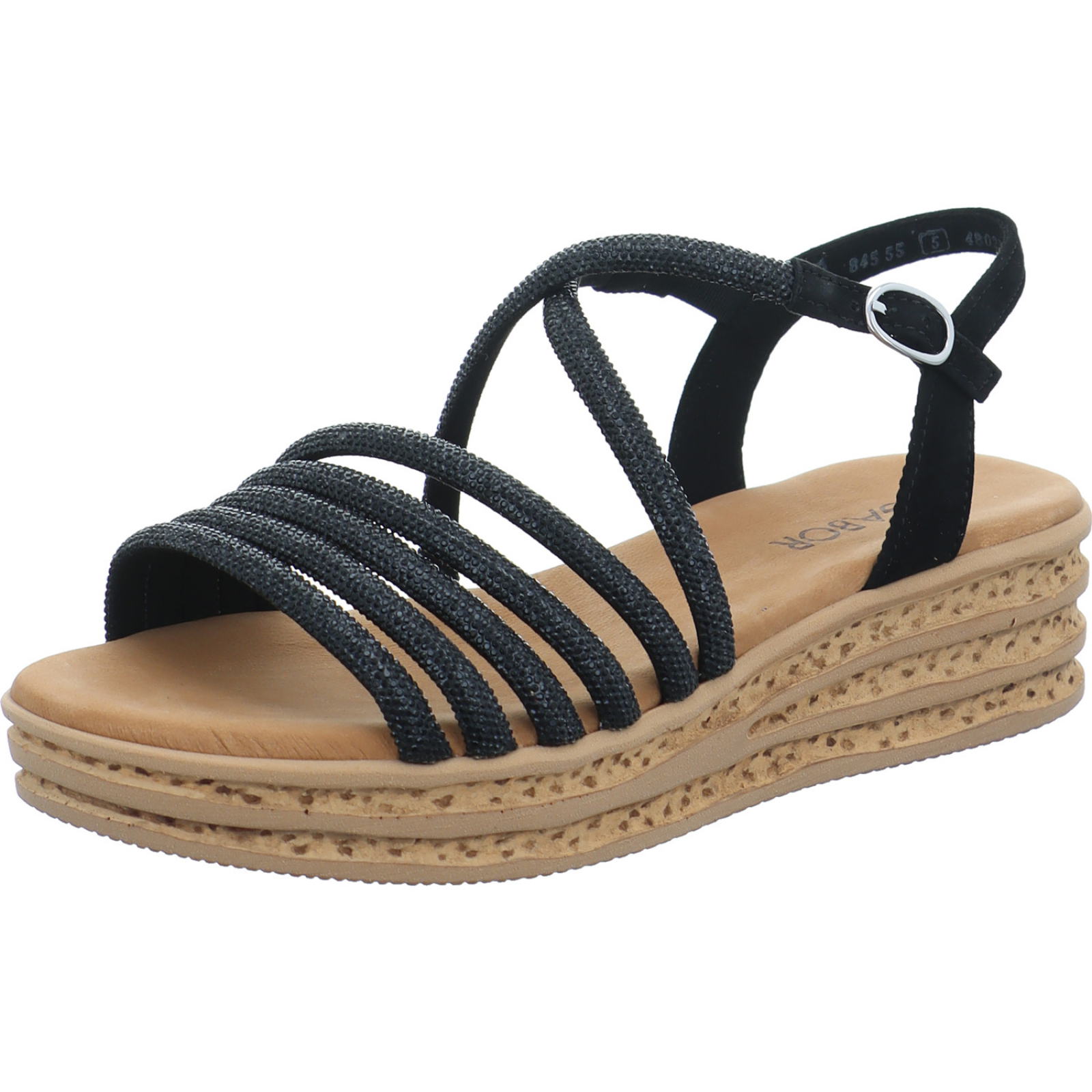 info@gabor.com_____Die schwarze Damen-Sandalette 84.555.87 von Gabor besteht aus Veloursleder und High-Tech mit viel Glitzer. Die Wellfeet Light Technologie bietet durch die optimale Dämpfung einen super Tragekomfort.