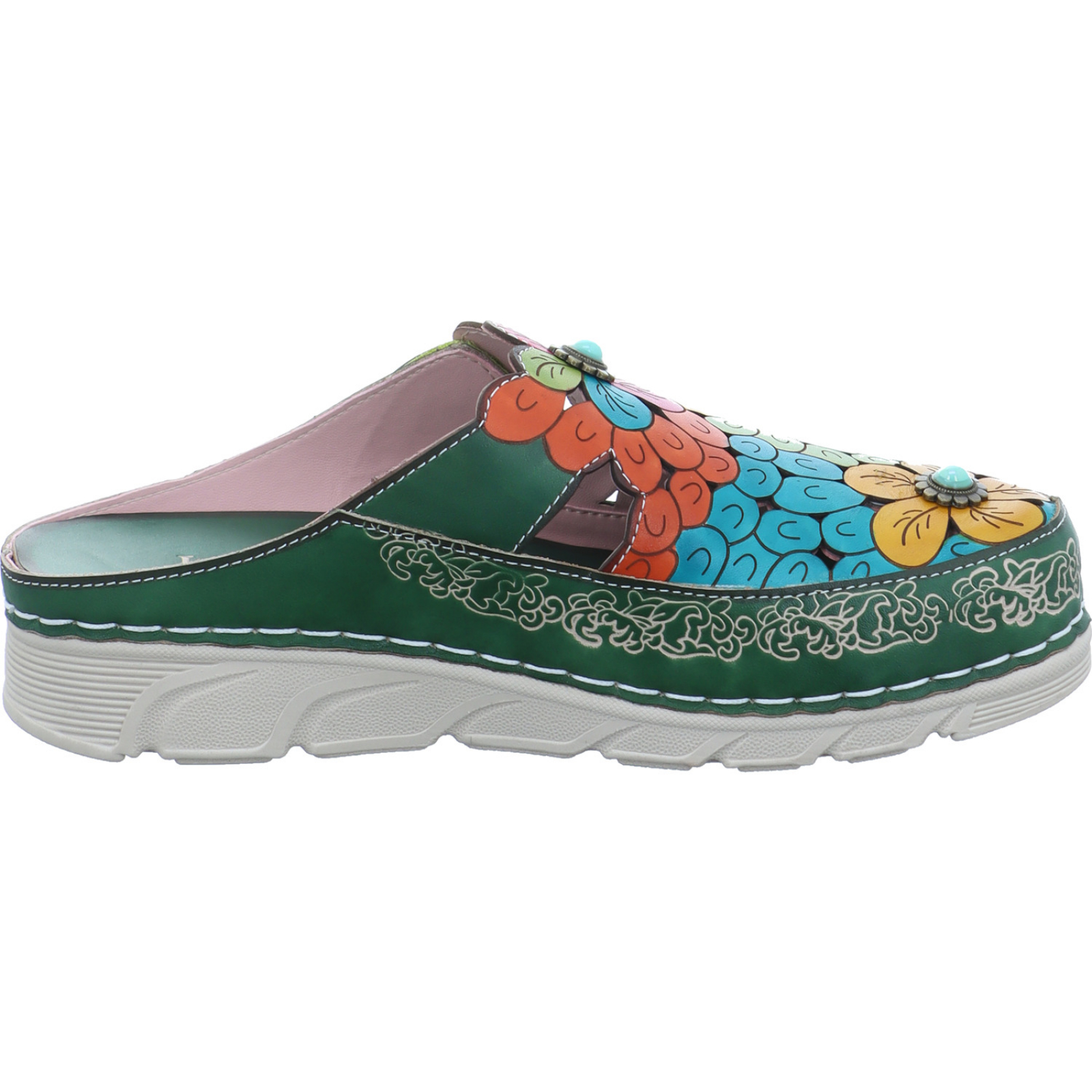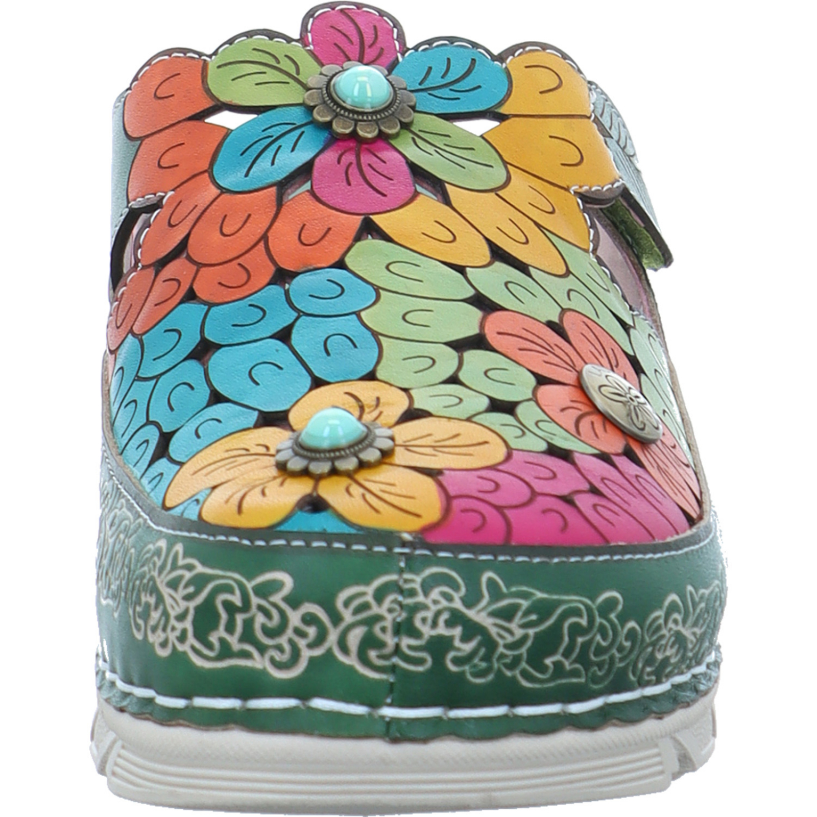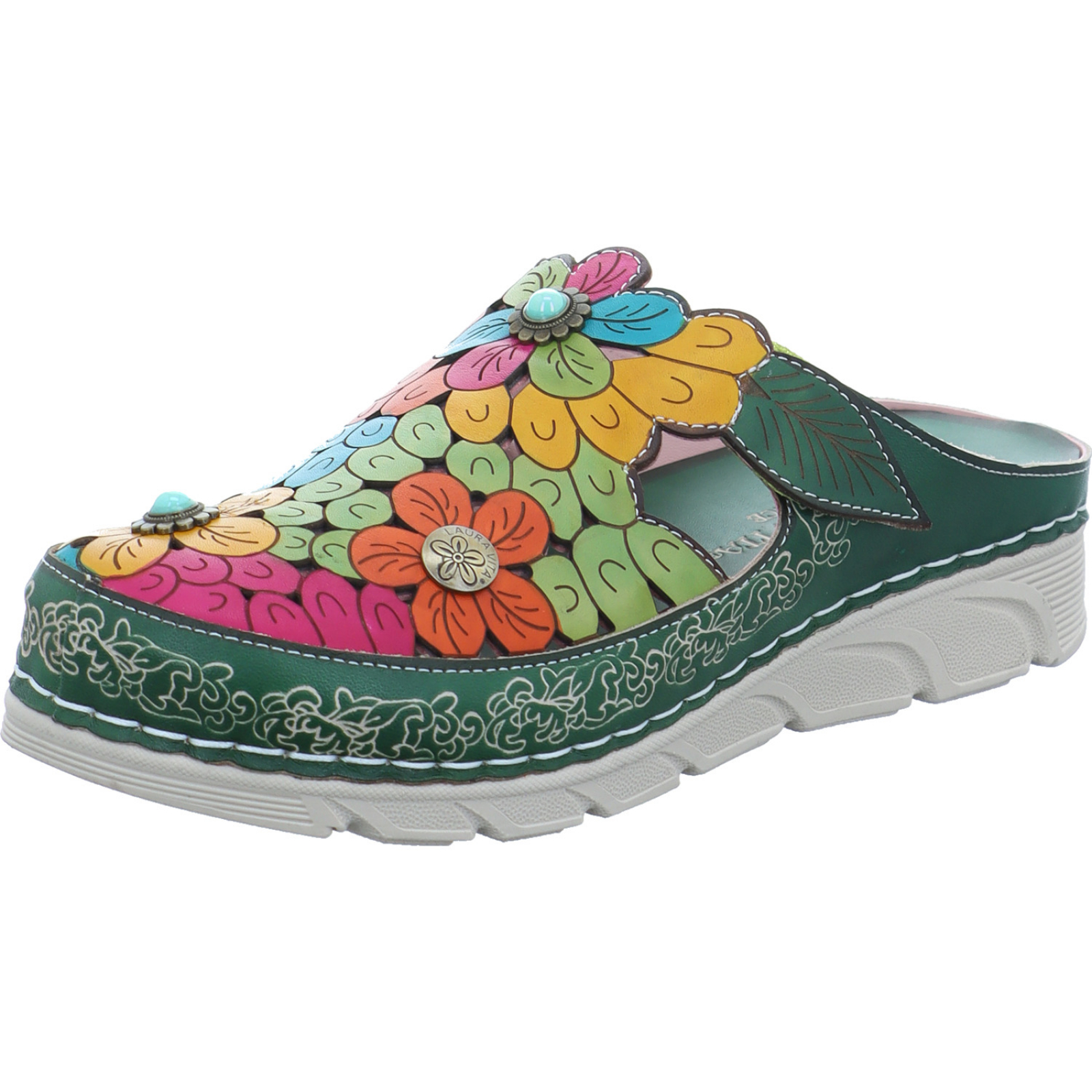 contact@lauravita.com _____Der grün-multifarbene Damen-Clog Dorry 22 AJ1819-B2 von Laura Vita passt durch sein Design perfekt zum Frühling und besteht aus Glattleder.