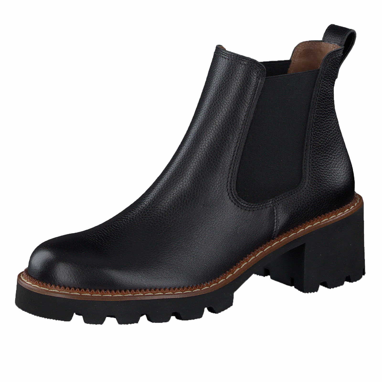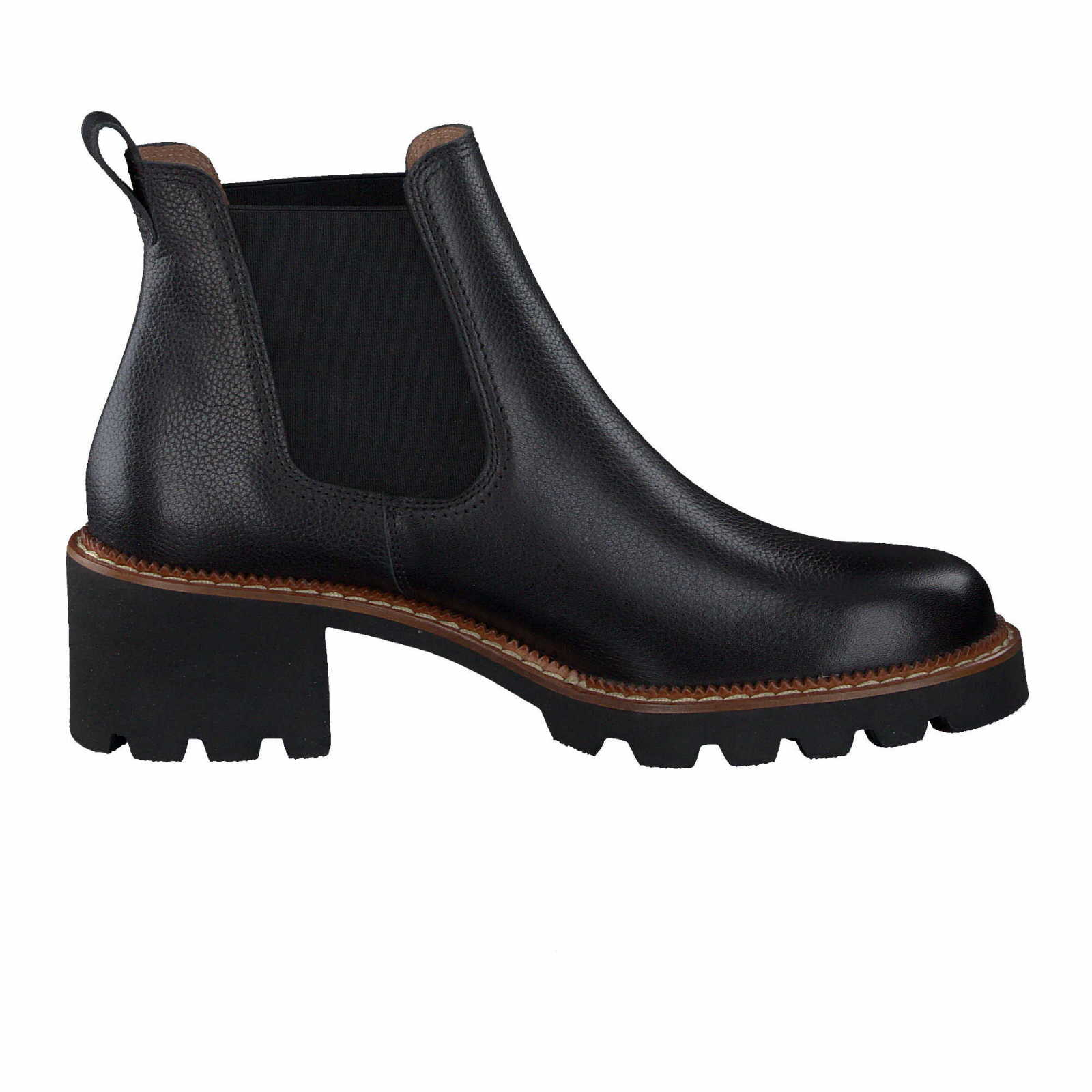 Dieser schwarze Damen Chelsea-Boot 9775-018 von Paul Green besteht aus genarbten Glatteder und hat zwei seitliche Stretch-Gummis.