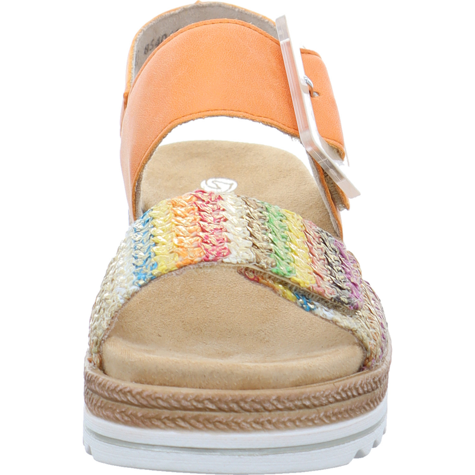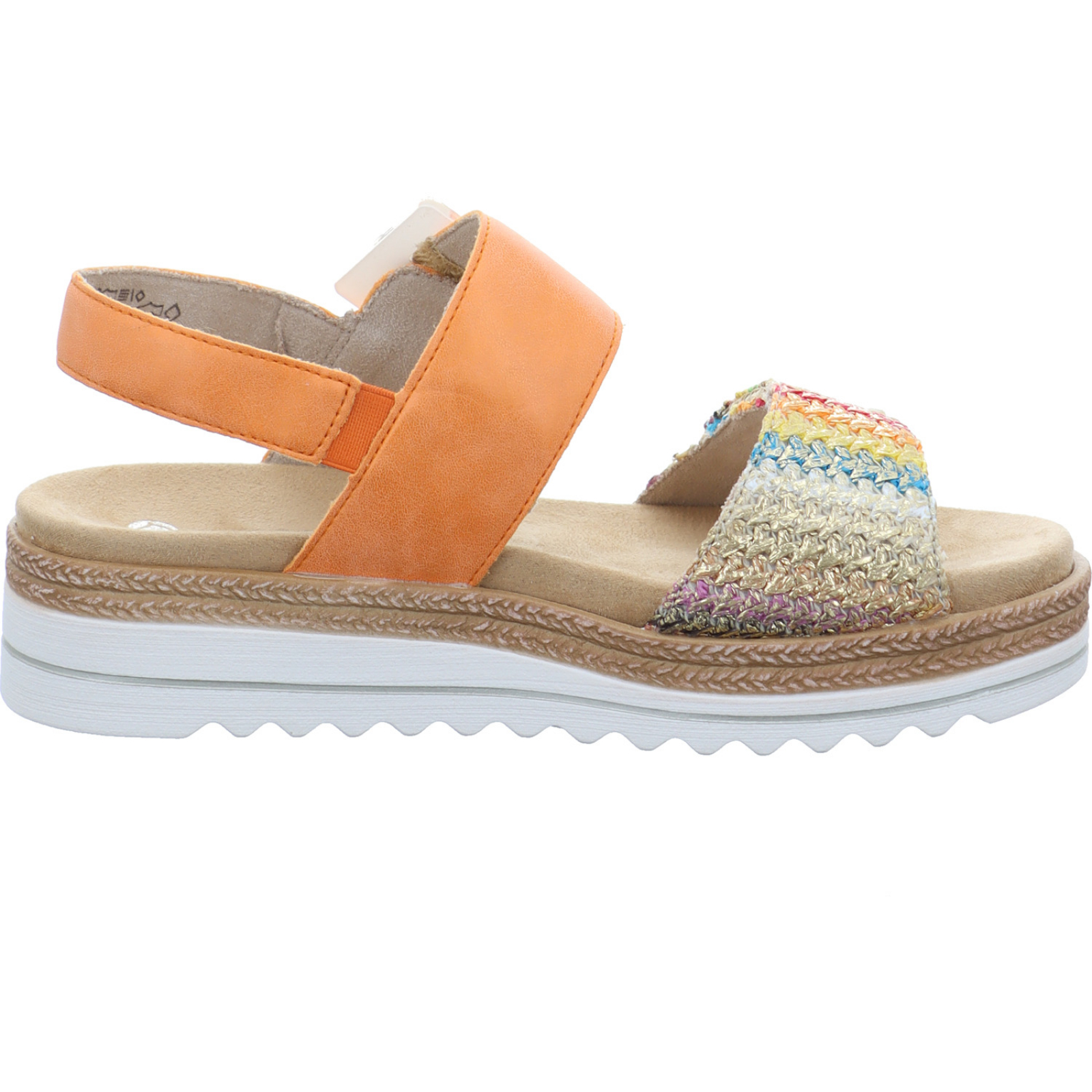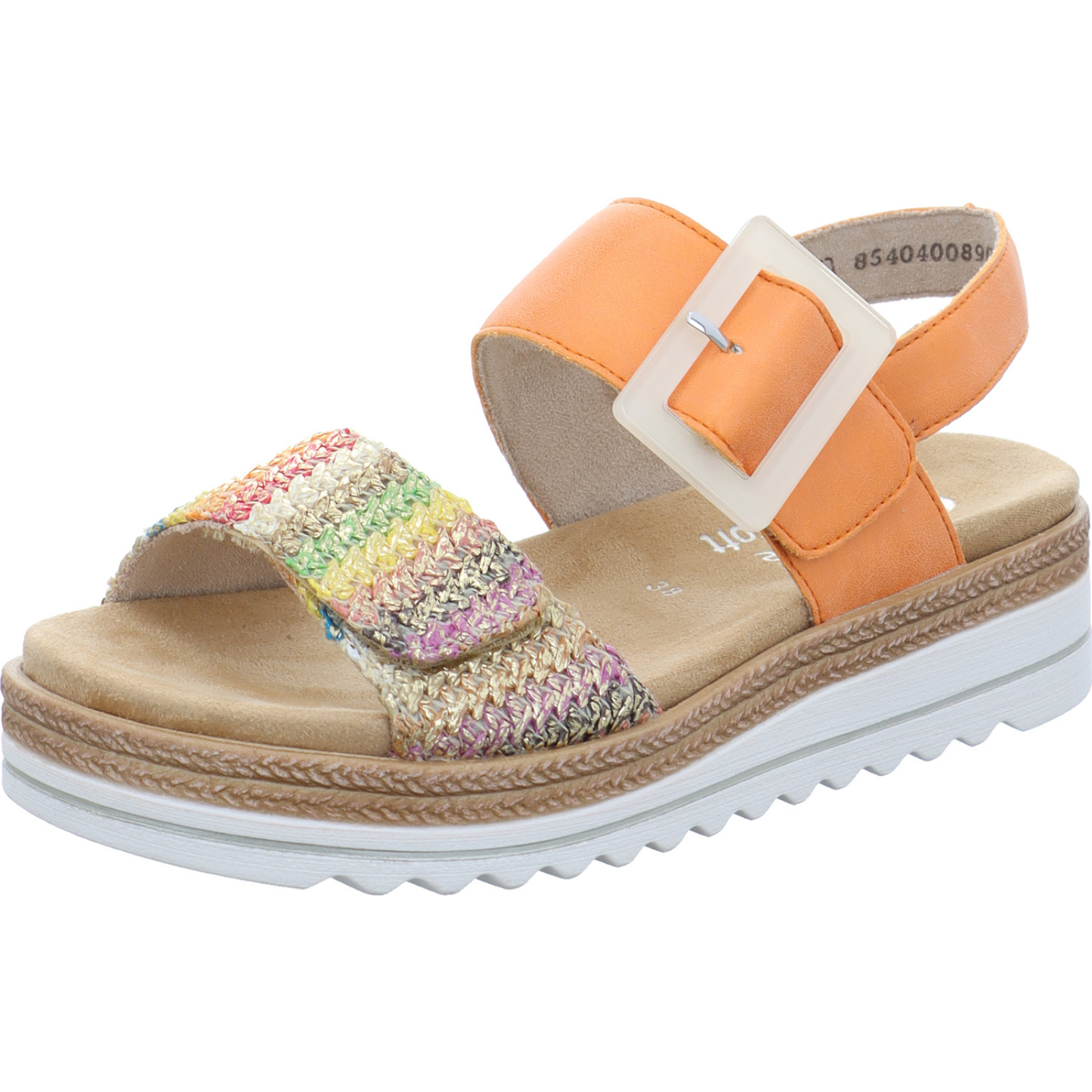 service@remonte.de_____Die orange-multifarbene Damen-Sandalette D0Q62-38 von Remonte besteht aus High-Tech und Textil. Durch das Wechselfußbett ist auch das Tragen von orthopädischen Einlagen möglich. Die schockabsorbierende Sohle dämpft jeden Schritt gezielt, was zu einem optimalen Tragekomfort beiträgt.