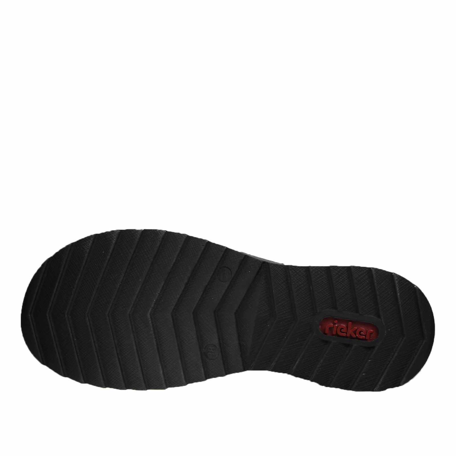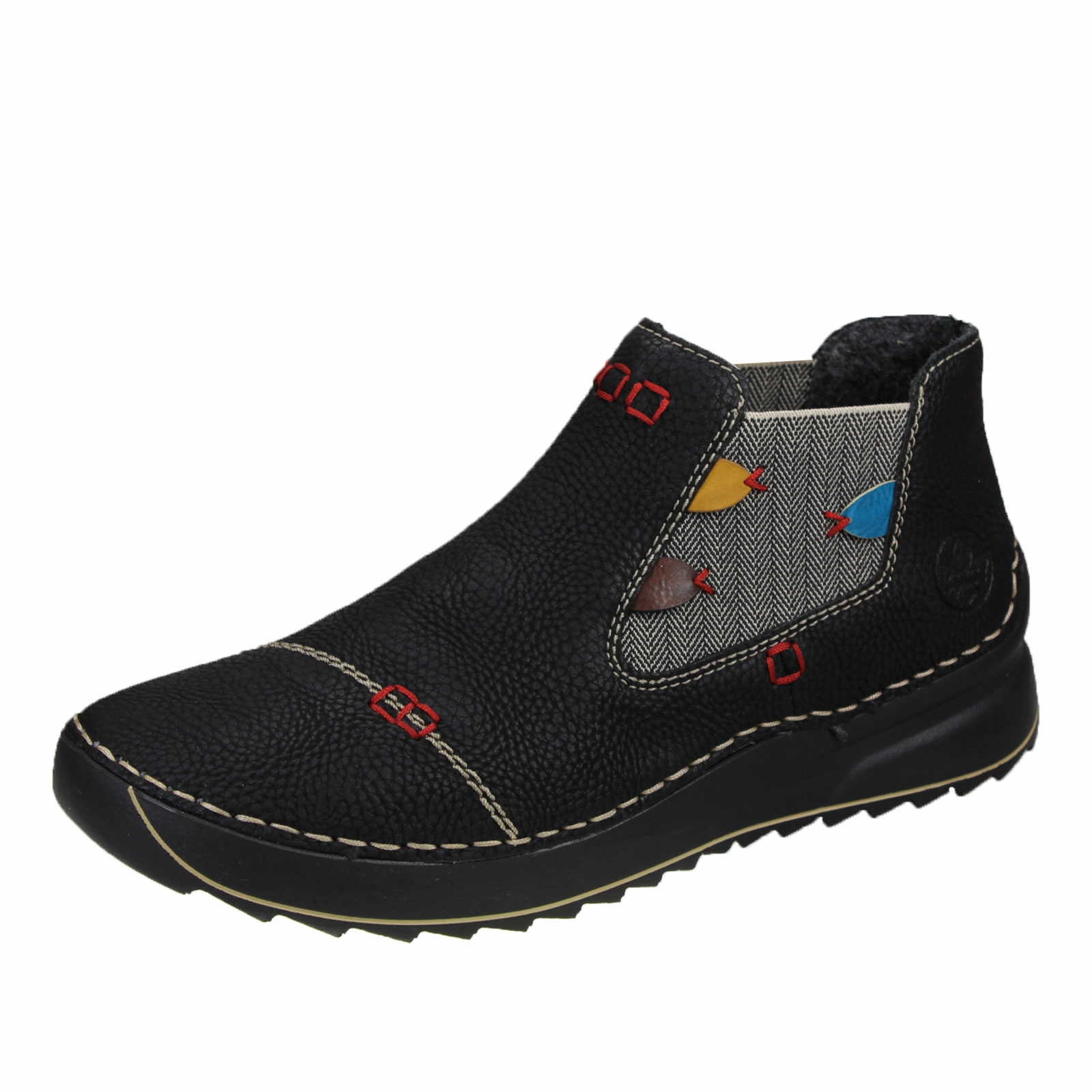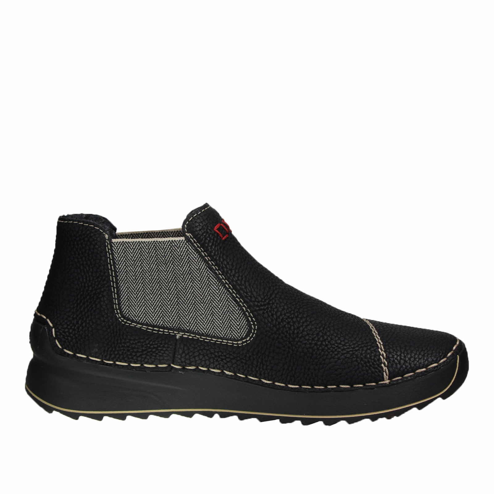 Diese schwarz-beige Damen-Stiefelette 51592-00 von Rieker besteht aus HighTech und Stretch-Gummi.