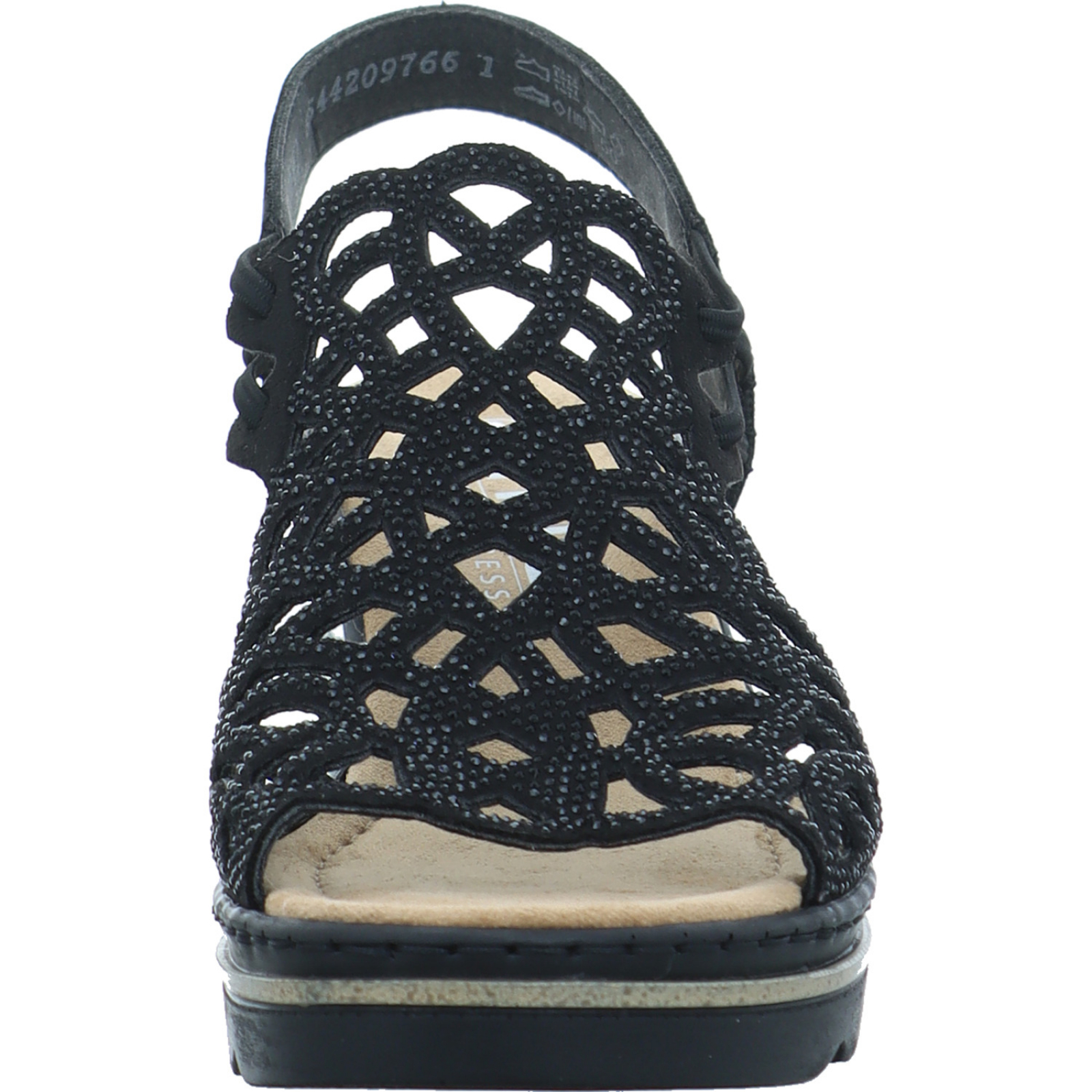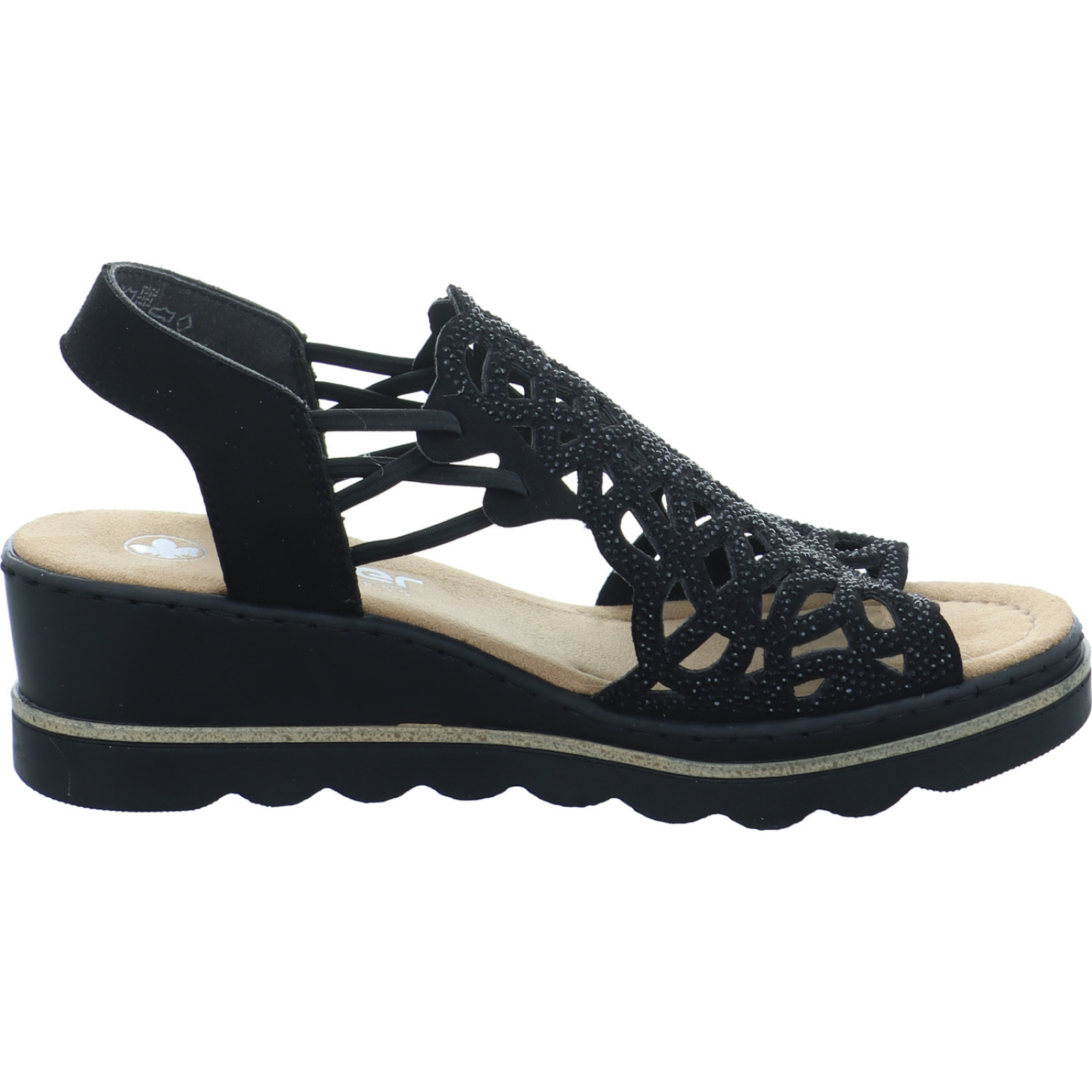 service@rieker.com_____Die schwarz-glitzernde Damen-Keilsandalette 67465-00 von der Firma Rieker besteht aus High-Tech. Durch die Antistress Technologie wird jeder Schritt gedämpft und in Kombination mit der weichen Innensohle bietet dieses Modell einen optimalen Tragekomfort.