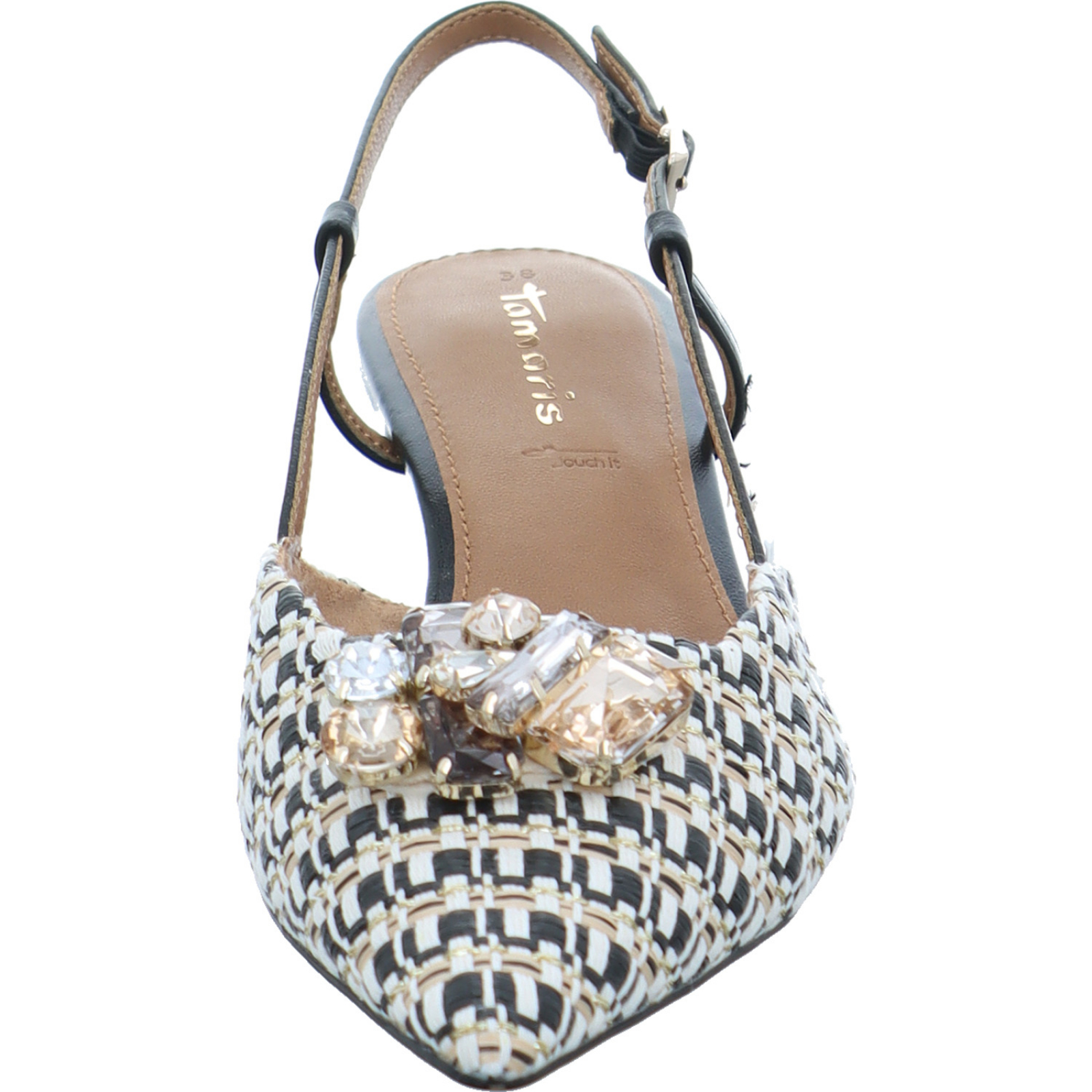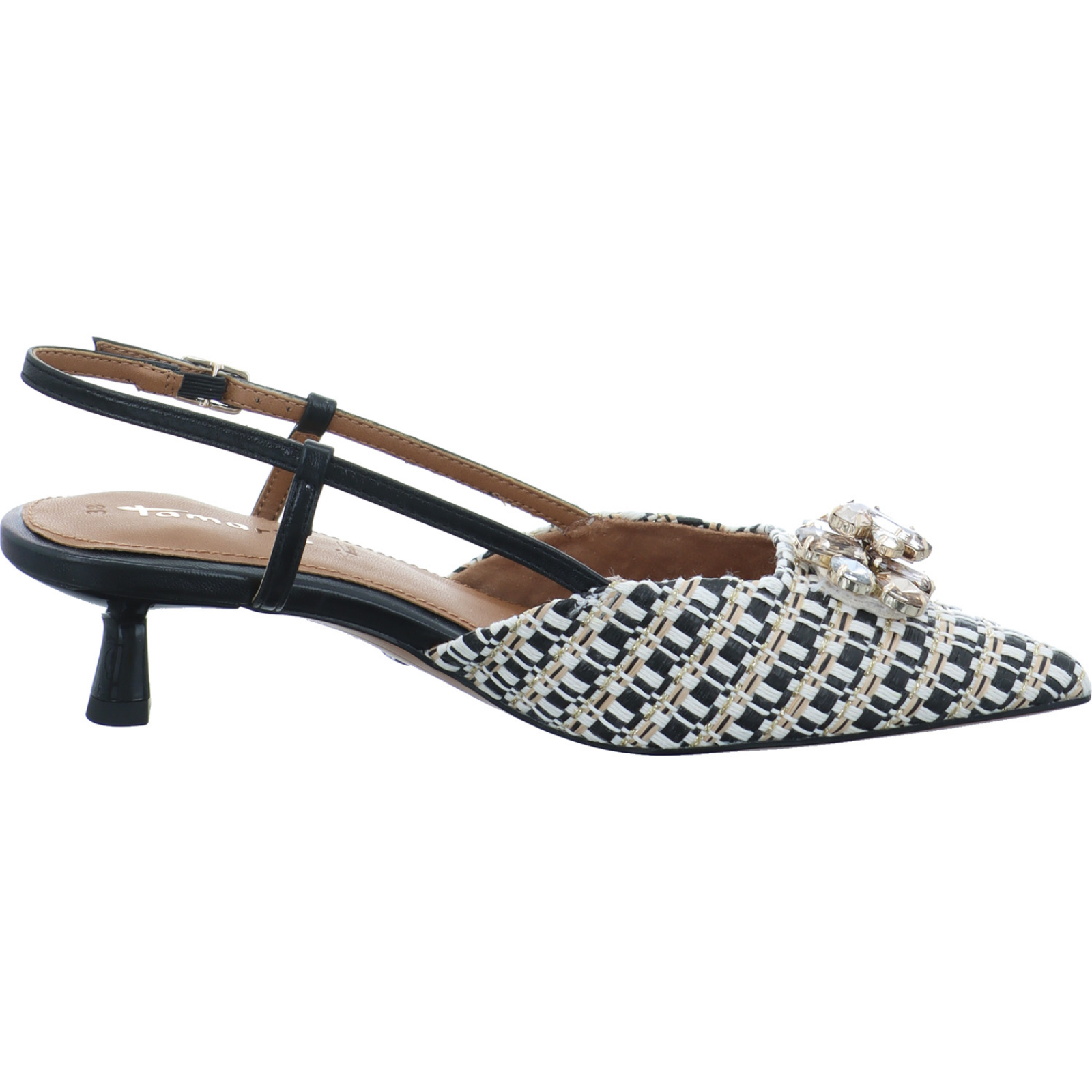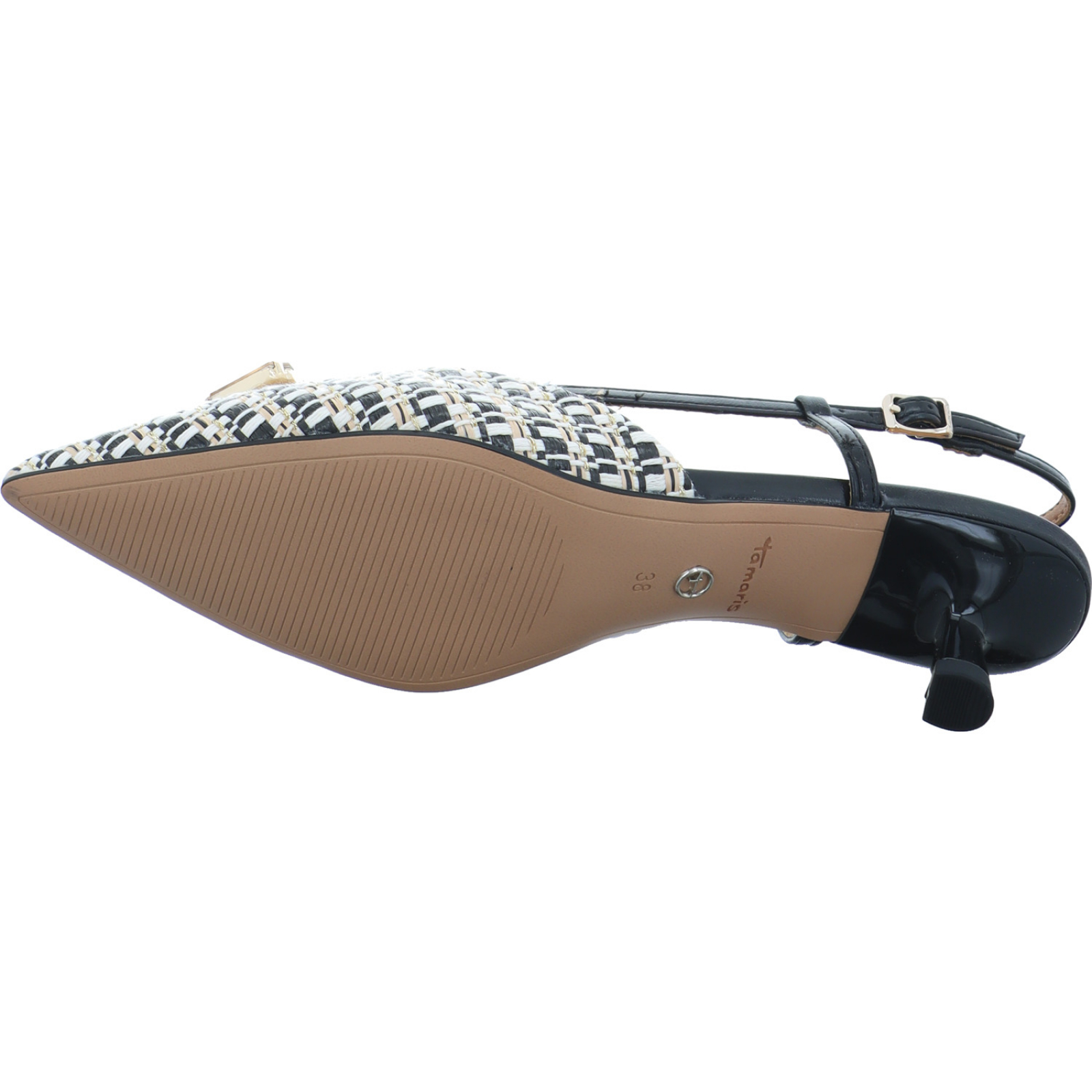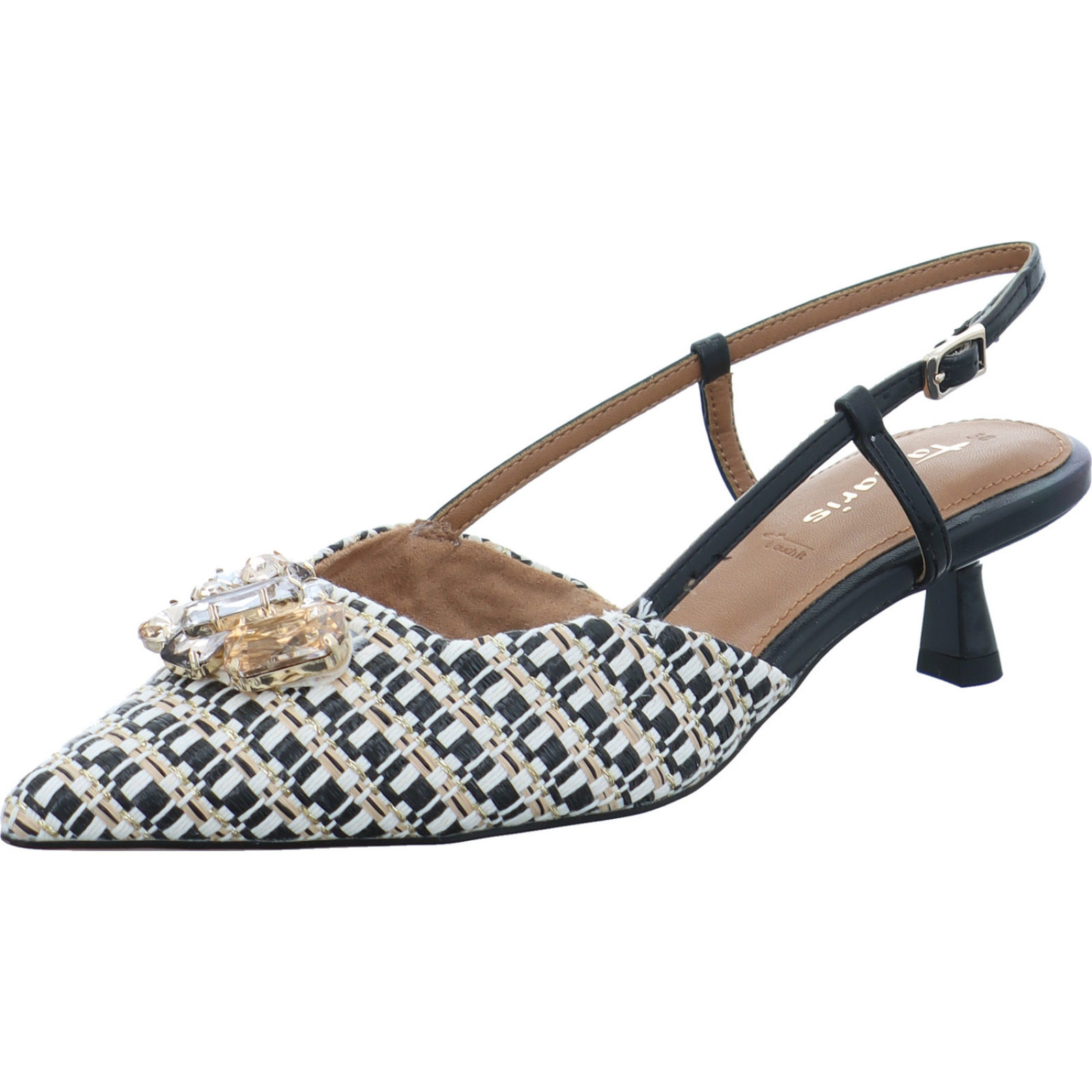 service.de@tamaris.com_____Ein absoluter Hingucker ist der schwarze-beige Damen-Sling 1-29512-46-098 von Tamaris bestehend aus Textil und High-Tech. Ob für einen festlichen Anlass oder bei einem sonnigen Tag, der Sling ist dank der komfortablen Innensohle der perfekte Begleiter.