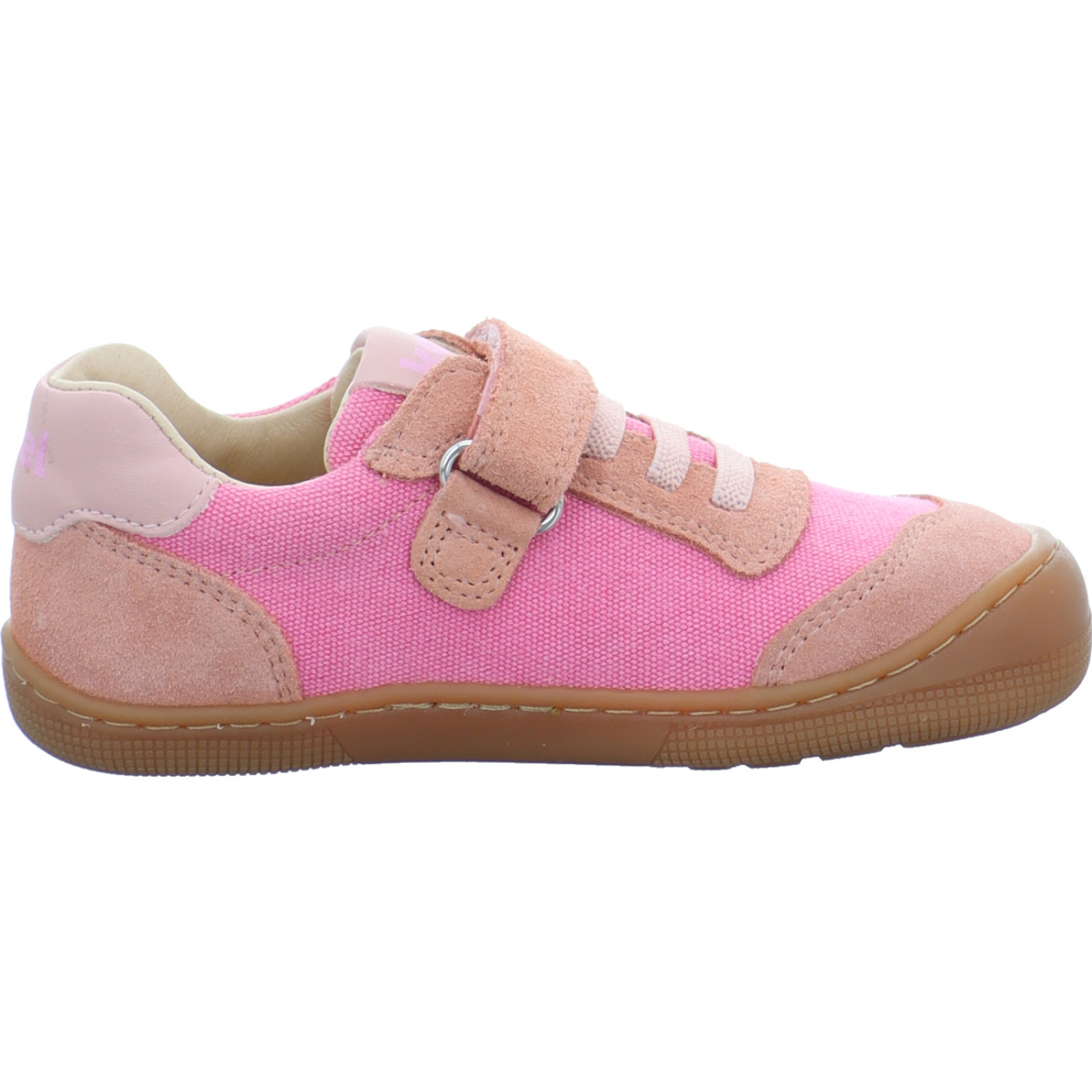 ____Perfekt für ein natürliches Abrollverhalten ist der pinke Mädchen-Barfußschuh 07M068.511-600 von der Firma Koel bestehend aus Veloursleder und Canvas.