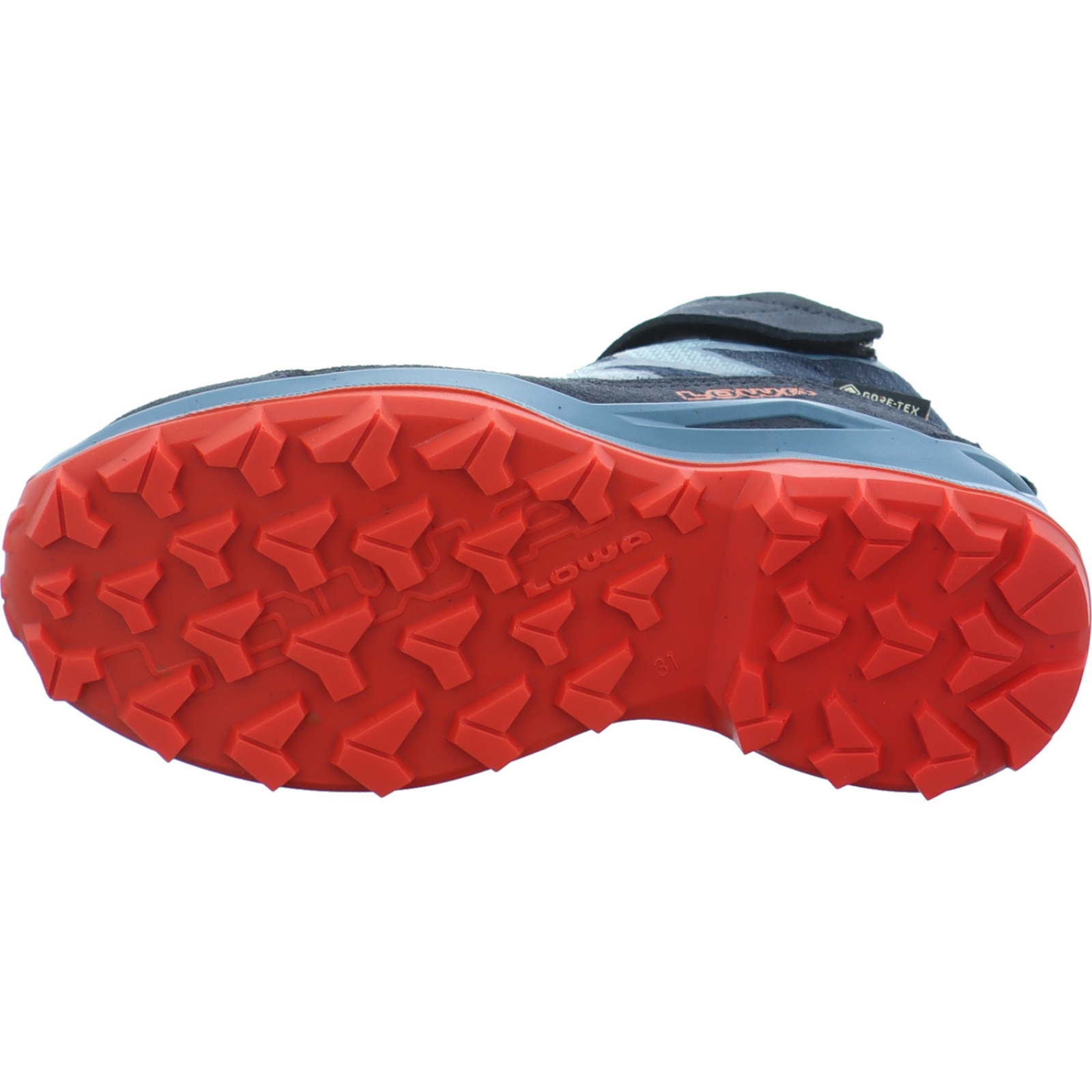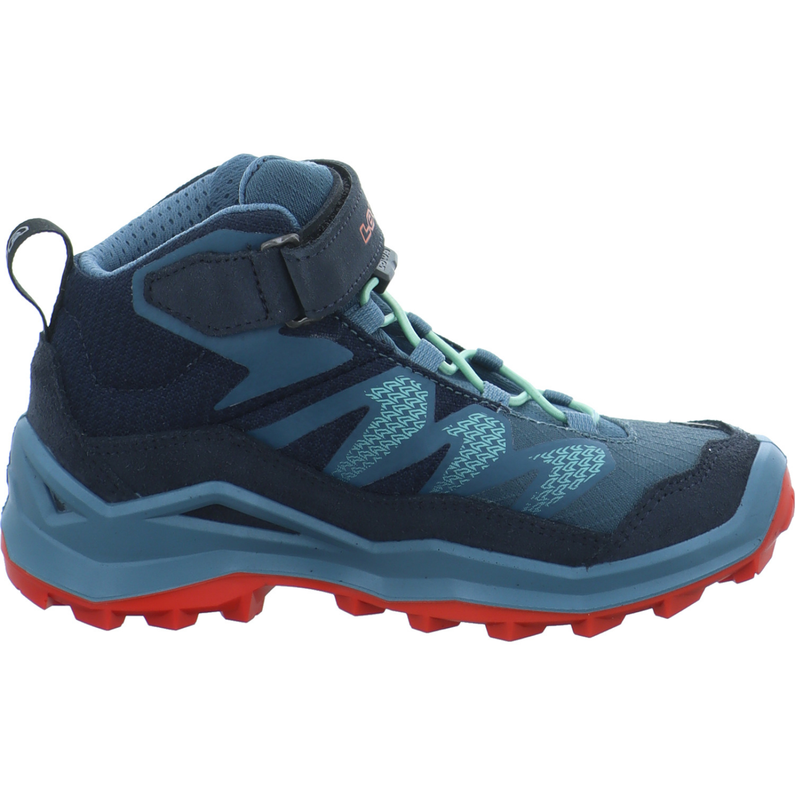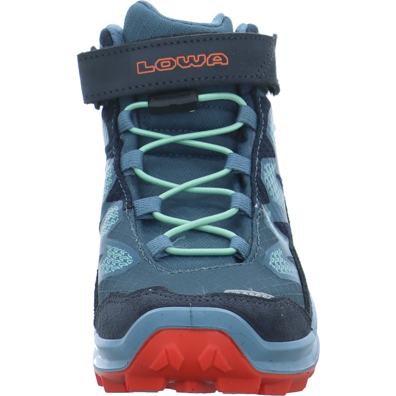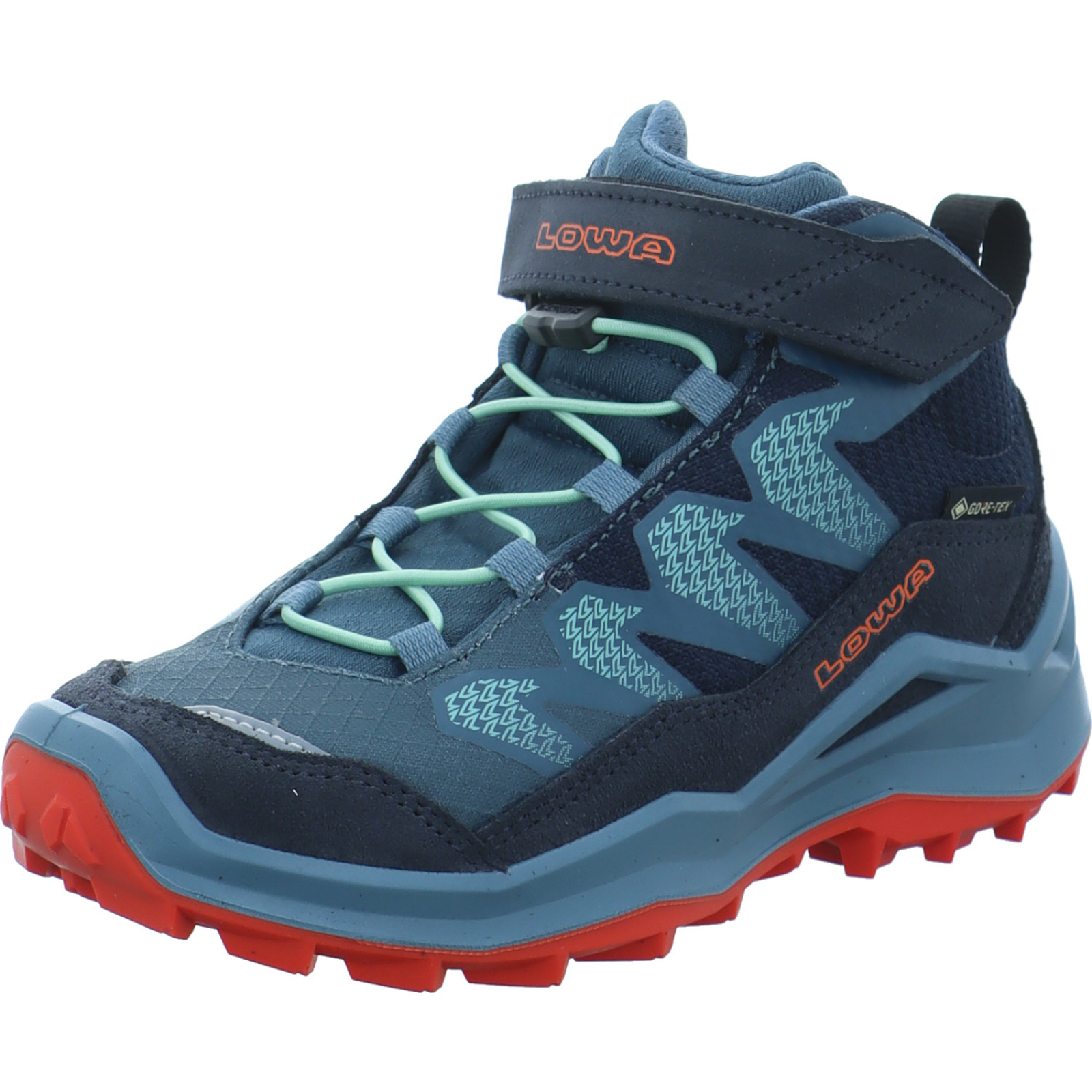 info@lowa.de_____Der navy-petrol-farbene Jungen-Wanderstiefel Maddox Pro GTX Mid VC JR 641629-6968 von Lowa besteht aus Mesh, High-Tech und Veloursleder.