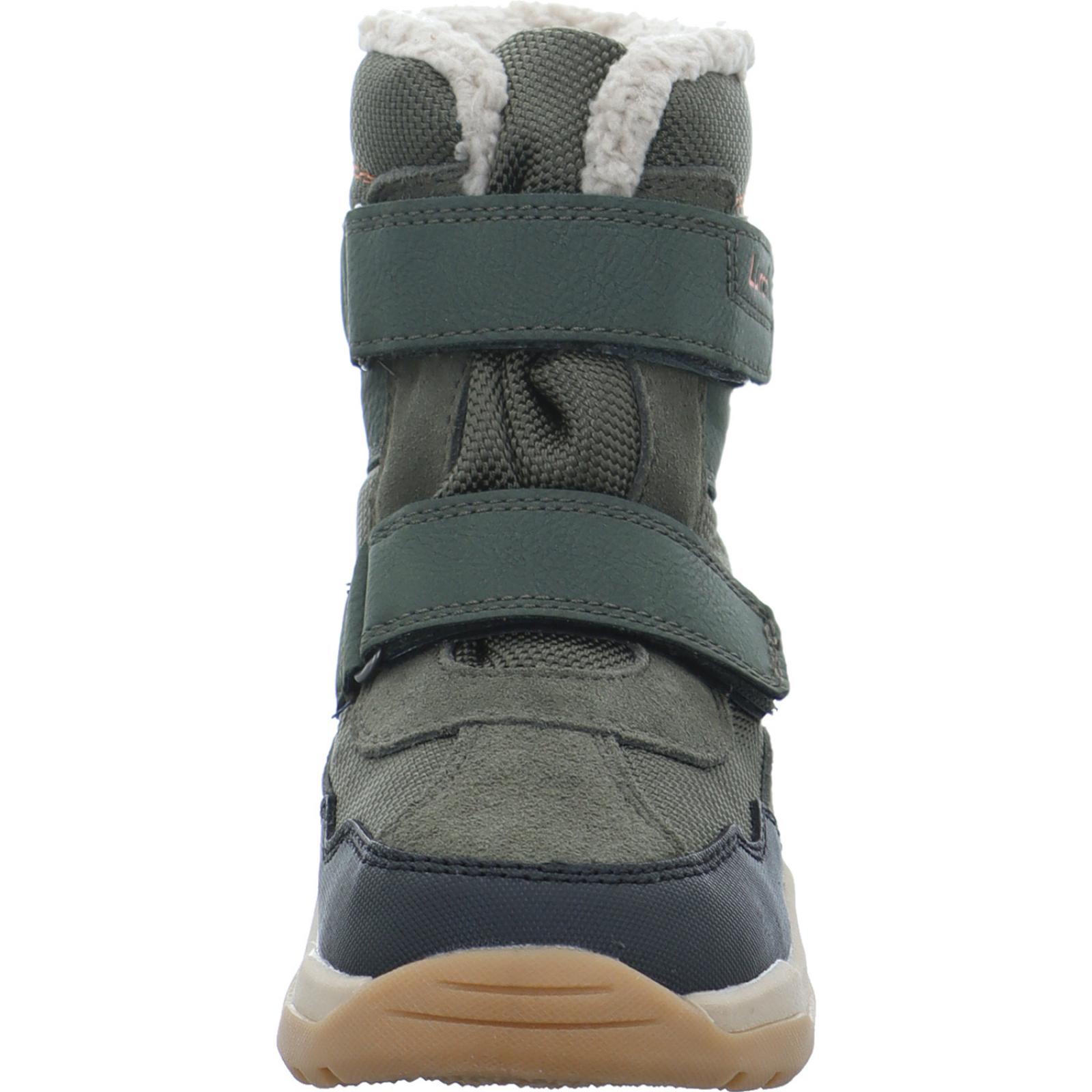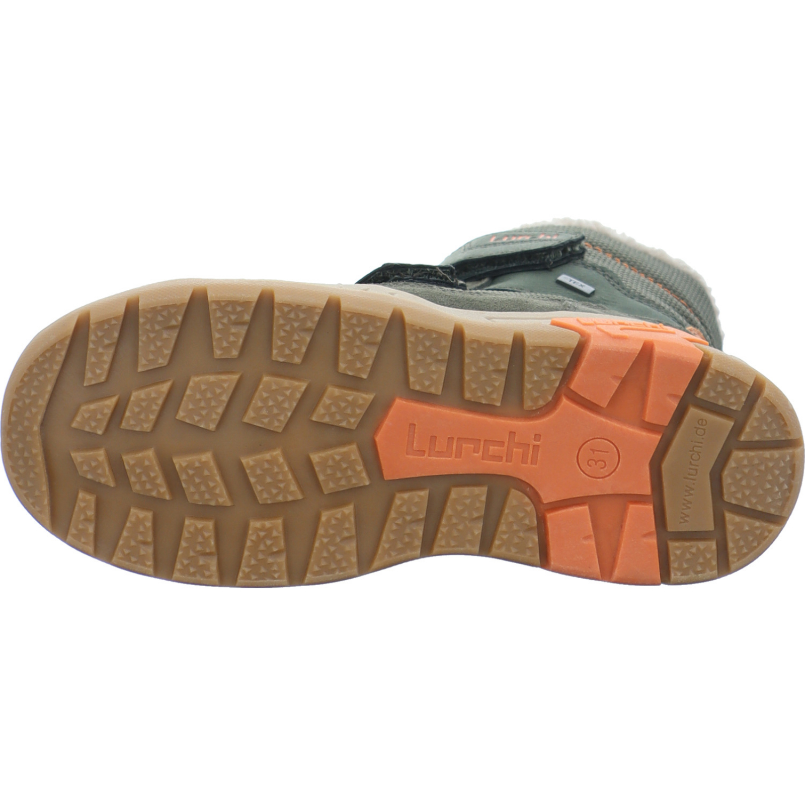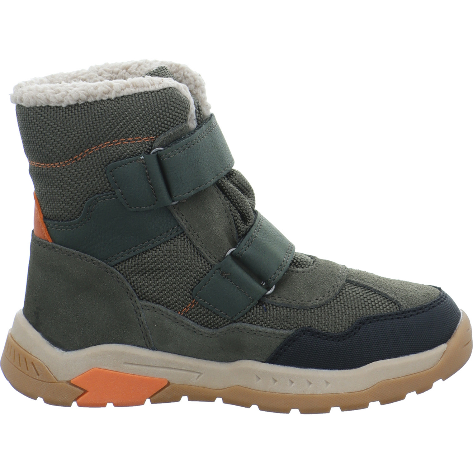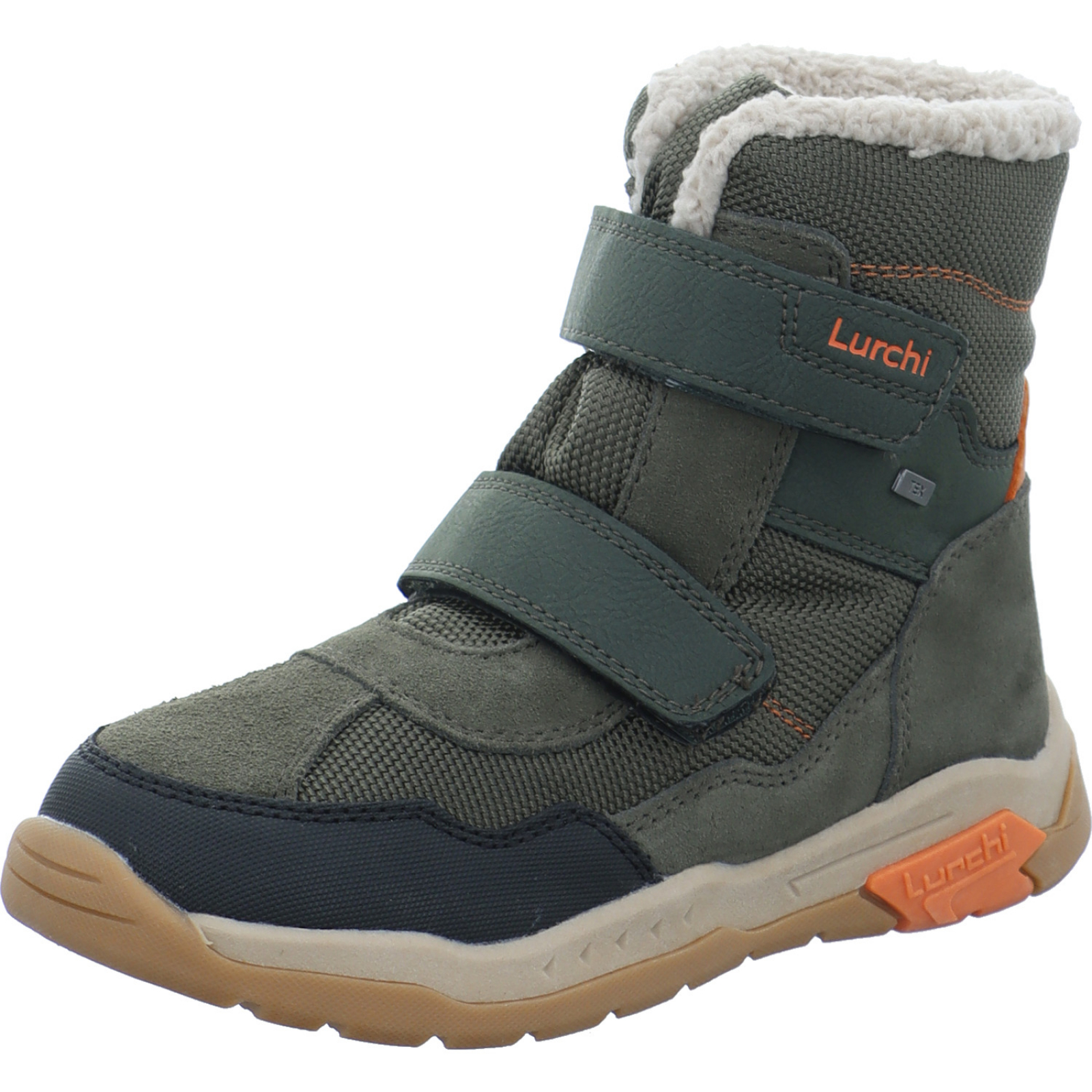info@supremo-shoes.de_____Der oliv-schwarz-orangene Jungen-Klettboot Nico 15L0013002/02413 von Lurchi besteht aus Veloursleder, Textil und High-Tech.