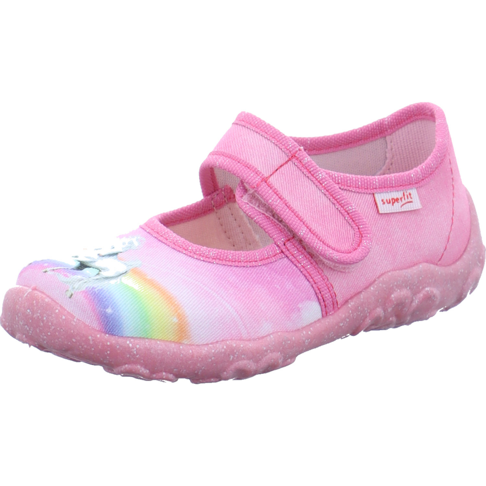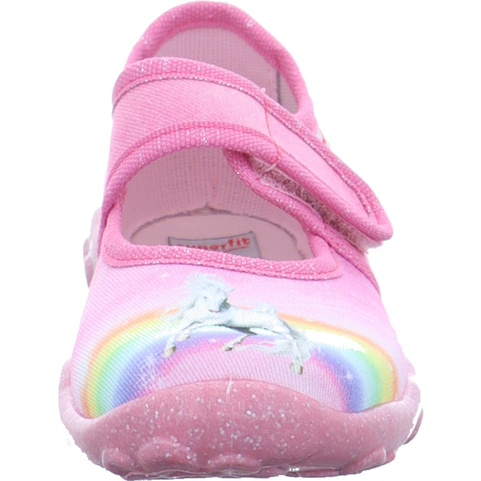 info@legero.com_____Der rosa-multifarbene Mädchen-Hausschuh Bonny 1-000281-5540 von Superfit besteht aus Canvas.