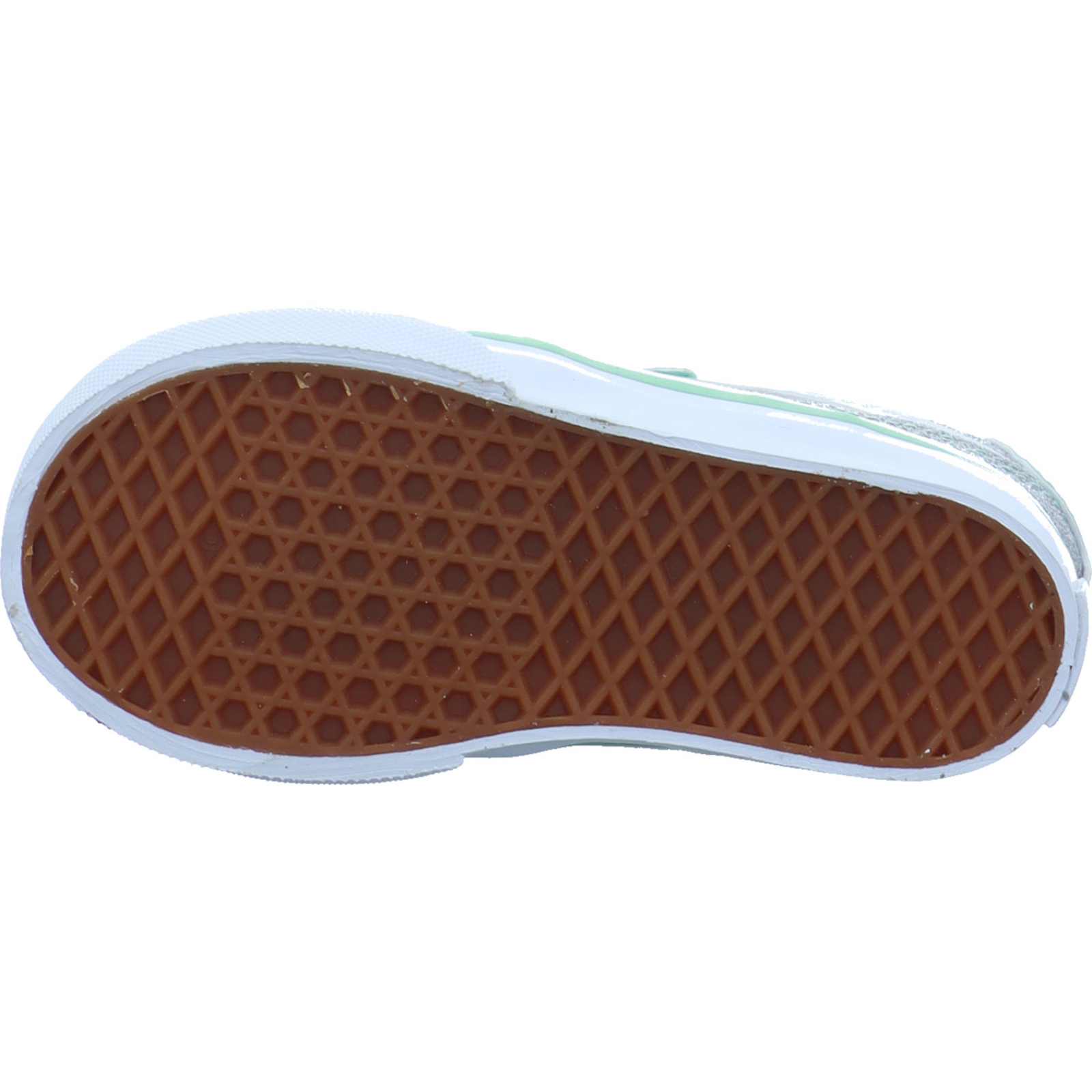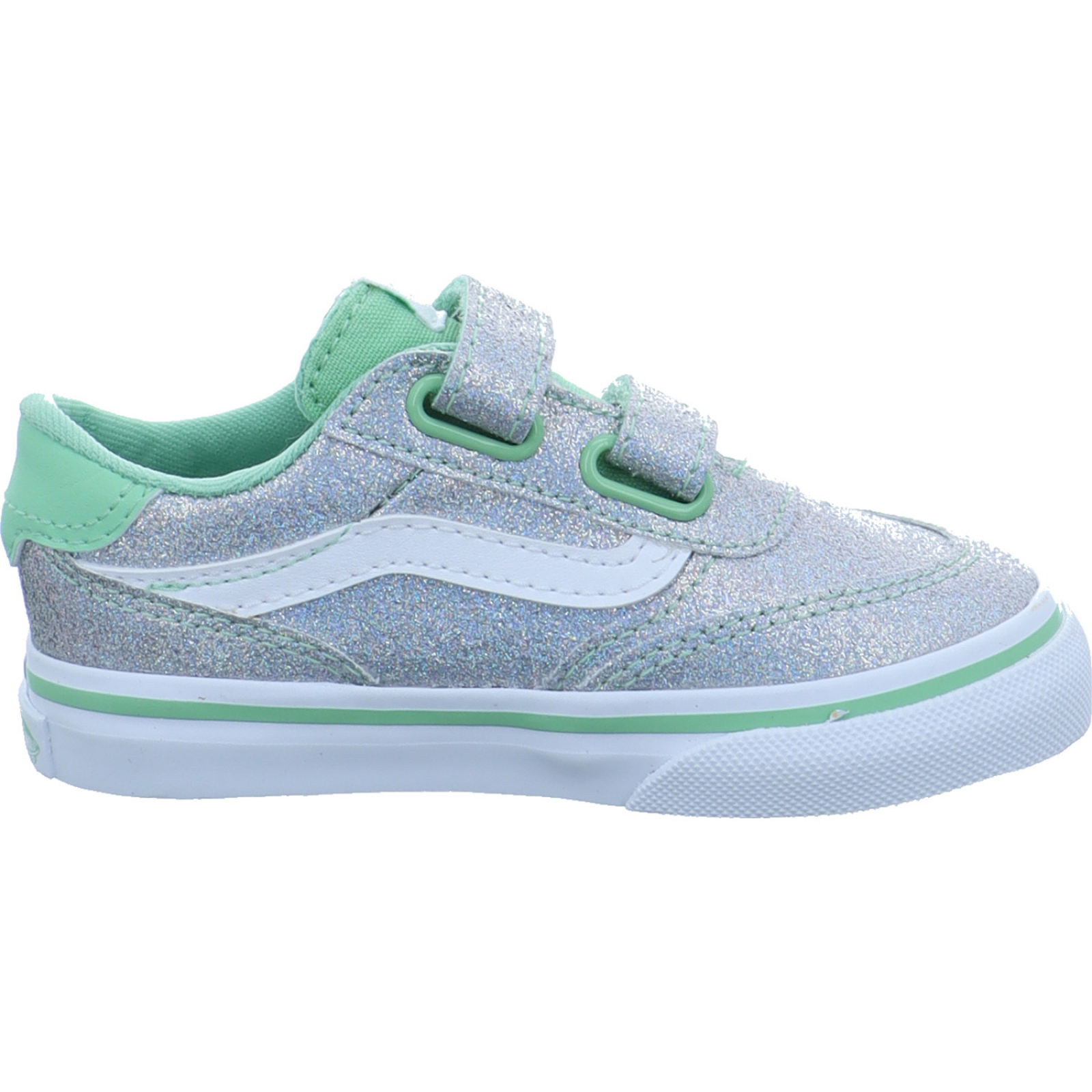 Herstellerinformation: Vans VF Germany Textil-Handels GmbH Walter-Gropius-Straße 23, 80807 München, DE Credit_DACH@vfc.com_____Der silber-grüne Mädchen-Sneaker Brooklyn LS V VN000D7XEMK1 von Vans besteht aus glitzernden High-Tech und Textil.